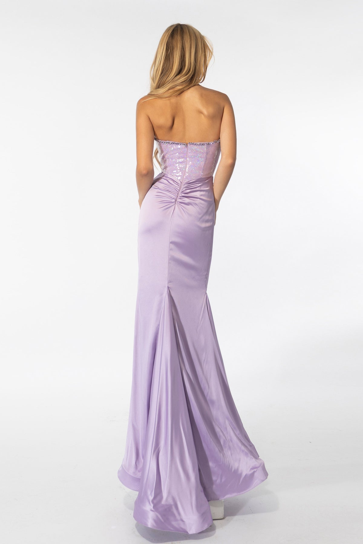 Make a bold entrance in this Ava Presley gown, style 39282, featuring a stunning sweetheart neckline adorned with sequins that shimmer with every move. The sleek, ruched bodice and high slit add a touch of allure, perfect for any prom or formal event.