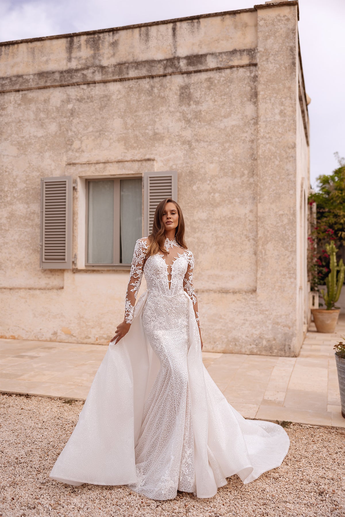 Behold the Maria Anette 5805—timeless elegance with a modern edge. This exquisite bridal gown features a sophisticated high neckline that exudes grace and refinement, paired with a flowing extension that adds movement and drama. The long silhouette creates a stunning vertical line that's both flattering and utterly romantic. Perfect for the bride who appreciates classic beauty with contemporary style, this dress promises to make you feel poised, radiant, and absolutely unforgettable on your special day.