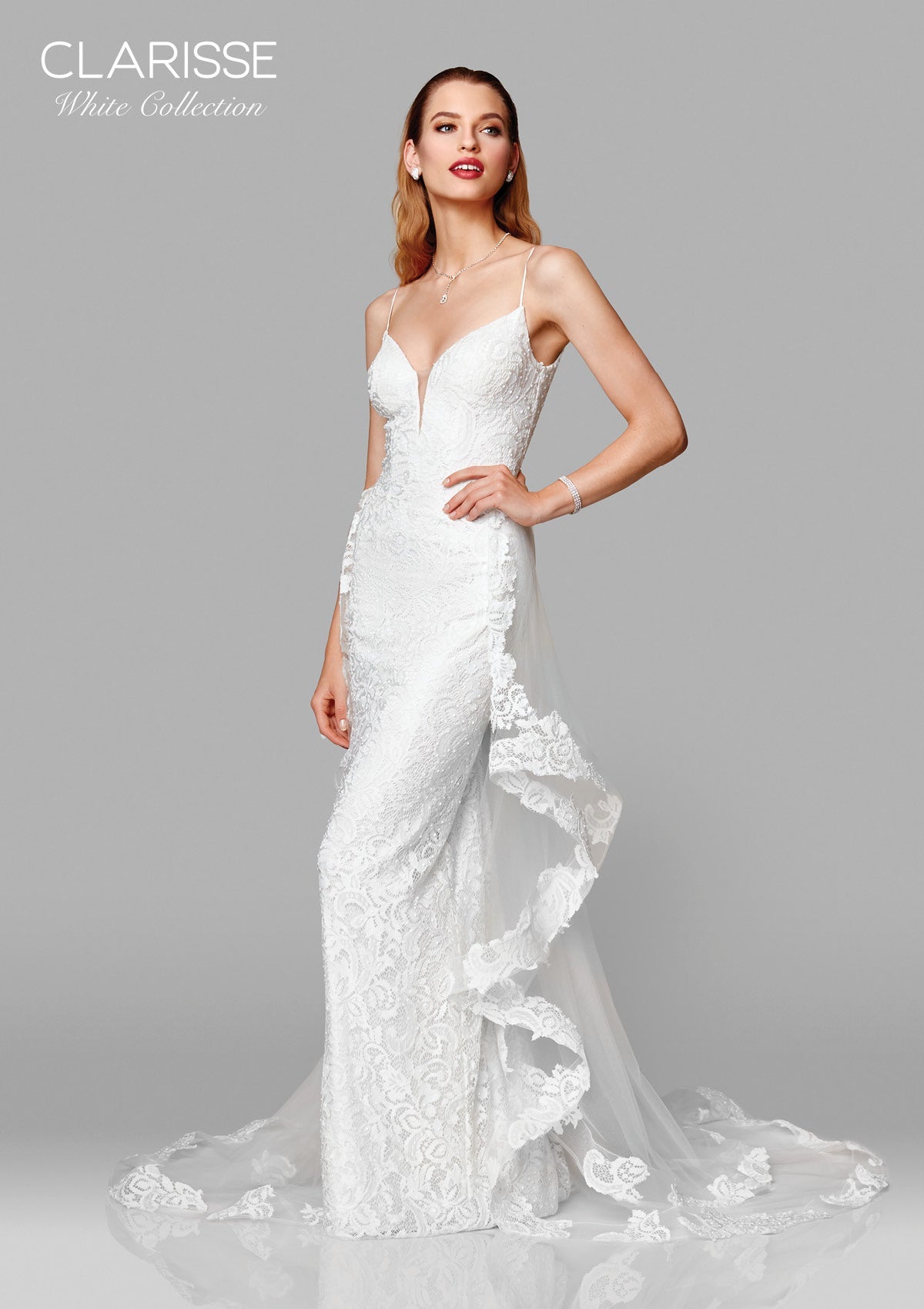 Stretch lace fitted bridal gown with a v-neckline and low back, featuring a detachable lace and tulle train.