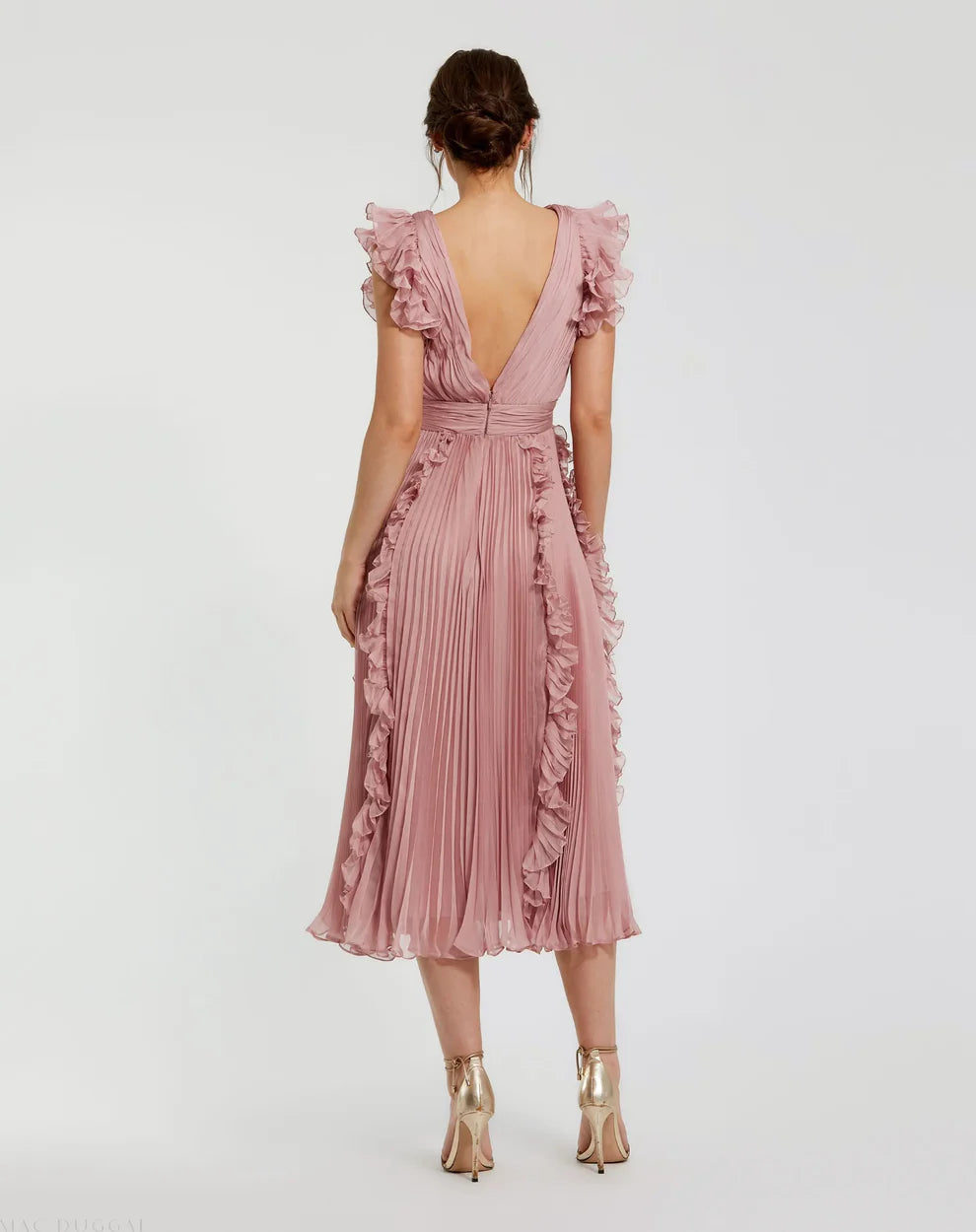 Timelessly elegant, this ruffled midi dress is the perfect look for any occasion. Crafted from flowy chiffon, this dress boasts a v-neckline, ruffled cap sleeves, and pleated detailing.
