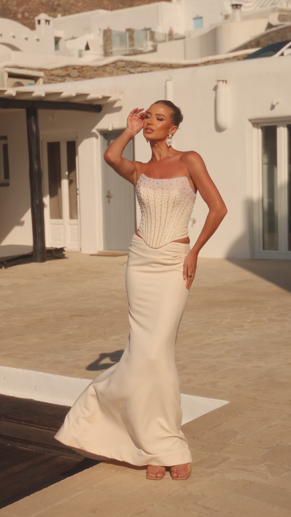 This sleek strapless design features a structured bodice with supportive boning and cascading bead embellishments that highlight the figure beautifully. The fitted sheath silhouette flows into a gentle flare at the hem, creating a refined and flattering shape.