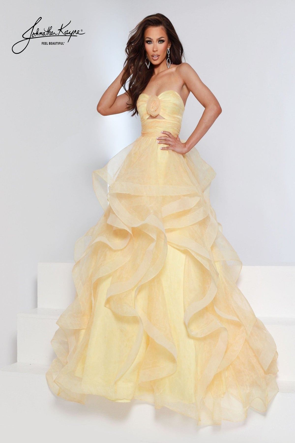 Step into the spotlight with the Johnathan Kayne 3271 Dress, where timeless elegance meets show-stopping glamour. This strapless ballgown features a beautifully ruched bodice adorned with delicate rosette details that frame your silhouette with grace. Cascading layered ruffles flow from the waist to the hem, creating movement and dimension with every step. The printed design adds a touch of sophistication while maintaining that romantic, pageant-ready aesthetic. Whether you're competing for your crown or making a grand entrance, this gown delivers the confidence and beauty you deserve to shine.