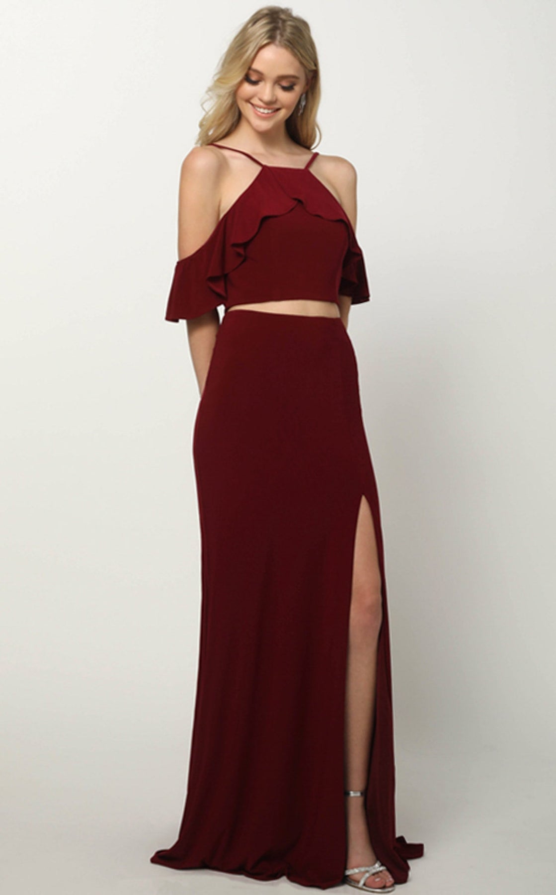 The Juliet 662 Dress is a two-piece ensemble designed to make you feel confident and beautiful. The fitted crop top features a striking halter neckline that transitions into delicate spaghetti straps, creating an elegant cold-shoulder effect. The high-waisted, form-fitting skirt flatters your silhouette with a gentle flare toward the hem and a thigh-high slit for added movement and style. This piece celebrates your curves while keeping the design minimal and impactful—ideal for any special occasion where you want to feel your best.