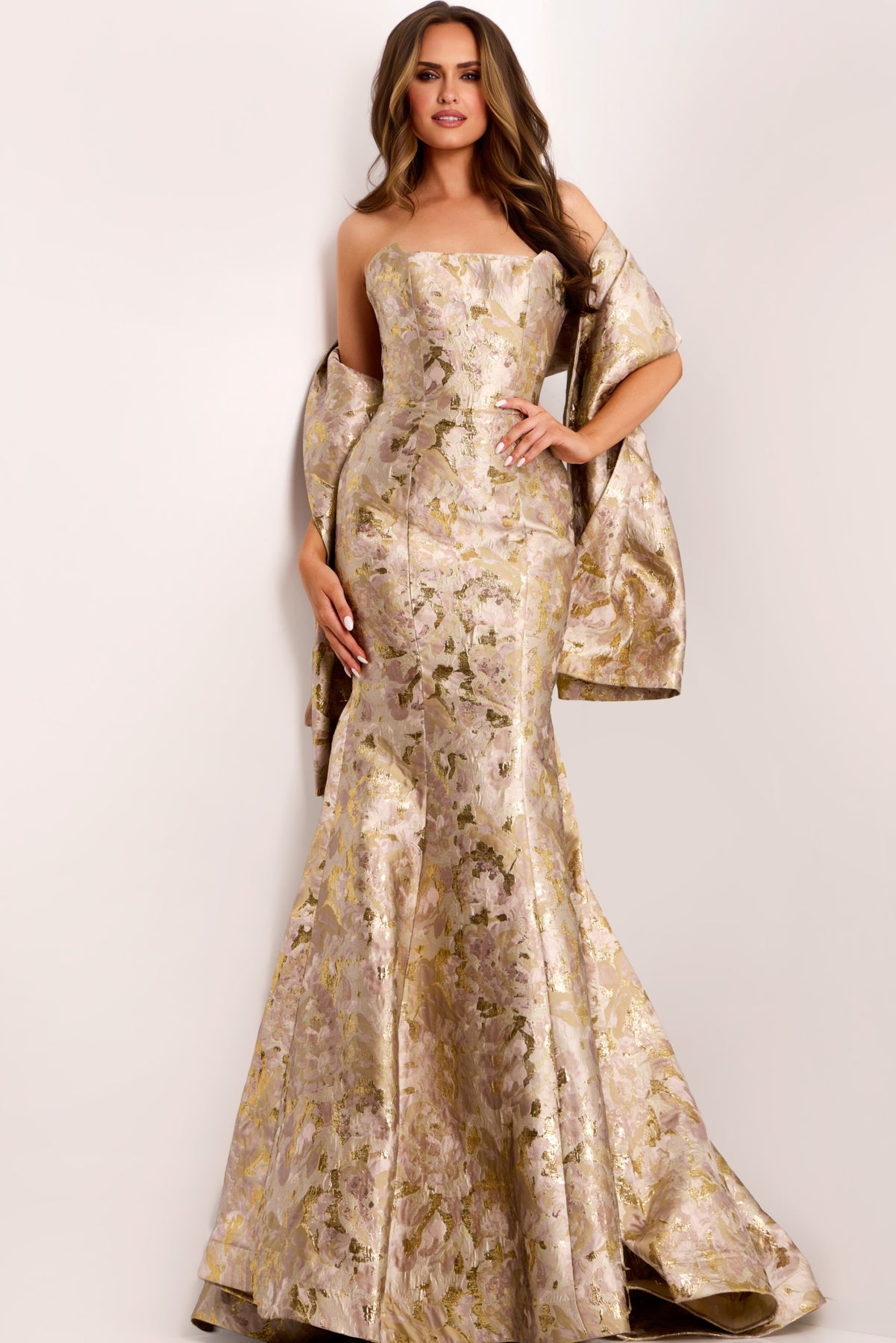 Turn heads with the Jovani 41131, a metallic floral strapless mermaid gown that dances with elegance. Its playful bow back adds a sweet surprise, perfectly balancing bold shimmer with flirty charm. This gown hugs your curves and flows gracefully, making every step a statement. Ready to sparkle and shine? This dress brings the drama and the fun in one unforgettable look.