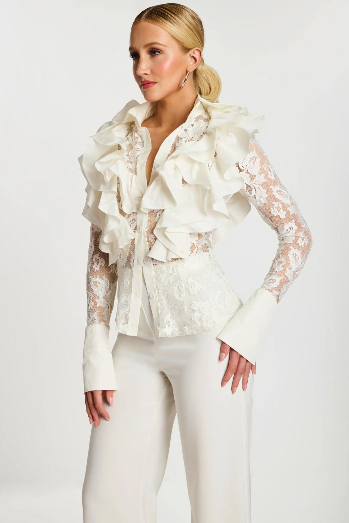 Step out in style with the Jovani 43365 suit, featuring a delicate lace ruffle blouse paired with flowing wide-leg satin pants. This playful set combines feminine charm and effortless elegance, perfect for making a statement at any event. The soft lace adds a touch of whimsy, while the satin pants offer comfort and movement for all-day confidence.