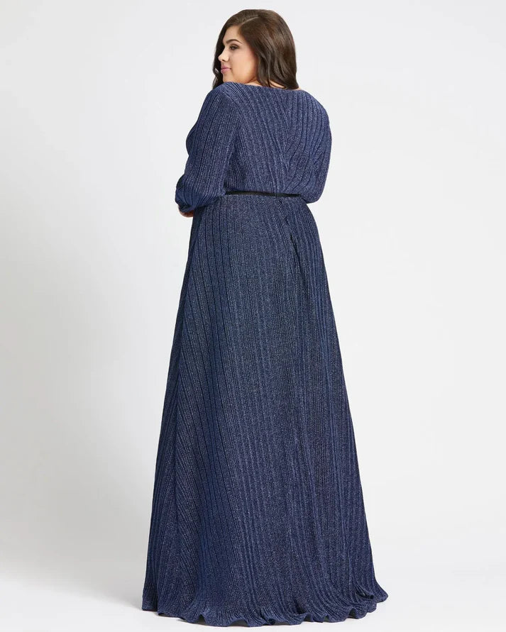 Elegant long sleeve evening with a pleated faux-wrap bodice, v-neckline, and a black belt at the waist.