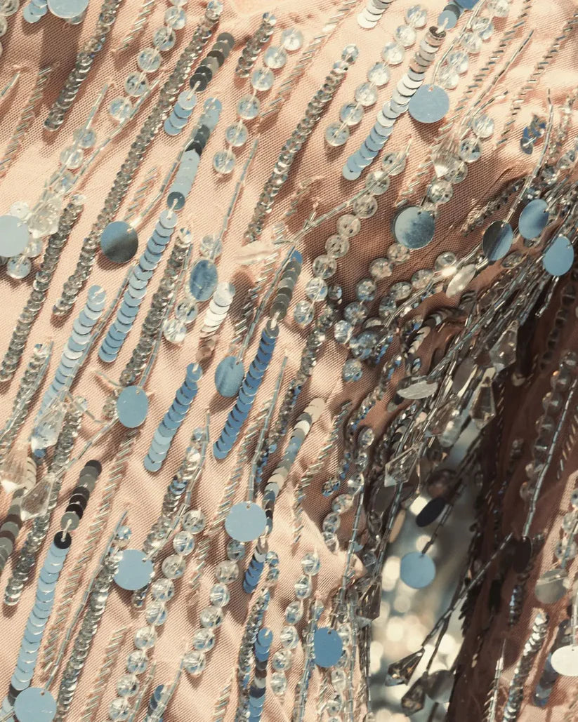 This captivating dress features intricate beading and playful fringe detail that exudes glamour and sophistication. The plunging neckline adds a touch of allure, while the long sleeves provide a balanced silhouette.