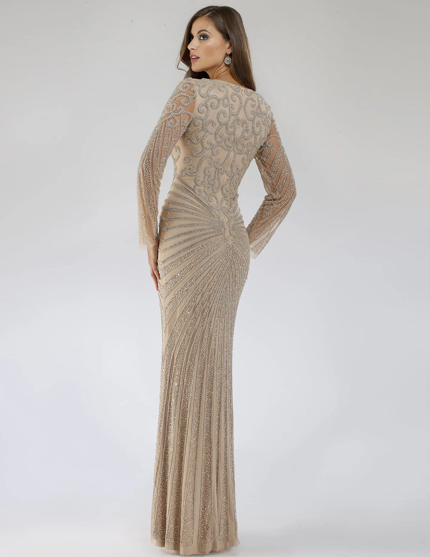 Fitted tulle fabric long sleeves v neckline long dress embellished with seed beads and sequins with beautiful design allover. Coming soon in new colors! Wear this to your engagement party, bridal event or a special dinner! You will catch the eyes of everyone there!