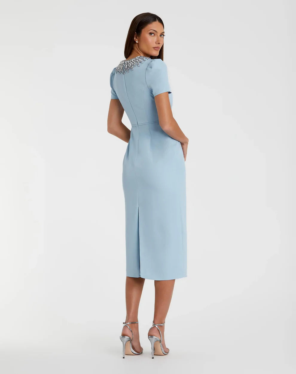 Make a statement in this elegant dress, featuring a hand-embellished collar with beads and encrusted rhinestones, it's the perfect look for cocktail parties and weddings.