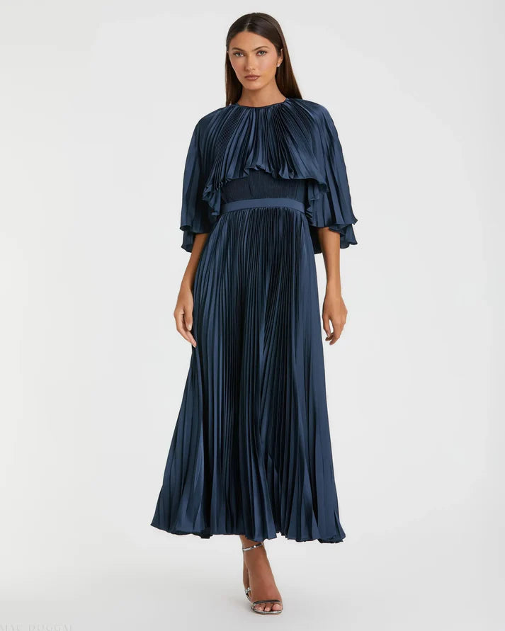 Graceful and refined, this tea-length dress features a pleated caplet design that exudes elegance. With its classic silhouette and sophisticated details, this dress is the epitome of timeless style.