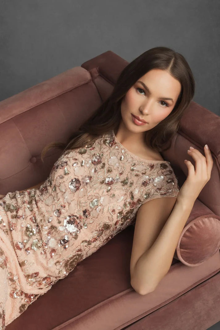 With its timeless bateau neckline and delicate cap sleeves, this gown exudes glamor. Perfect for formal affairs and special occasions, this gown is sure to leave a lasting impression