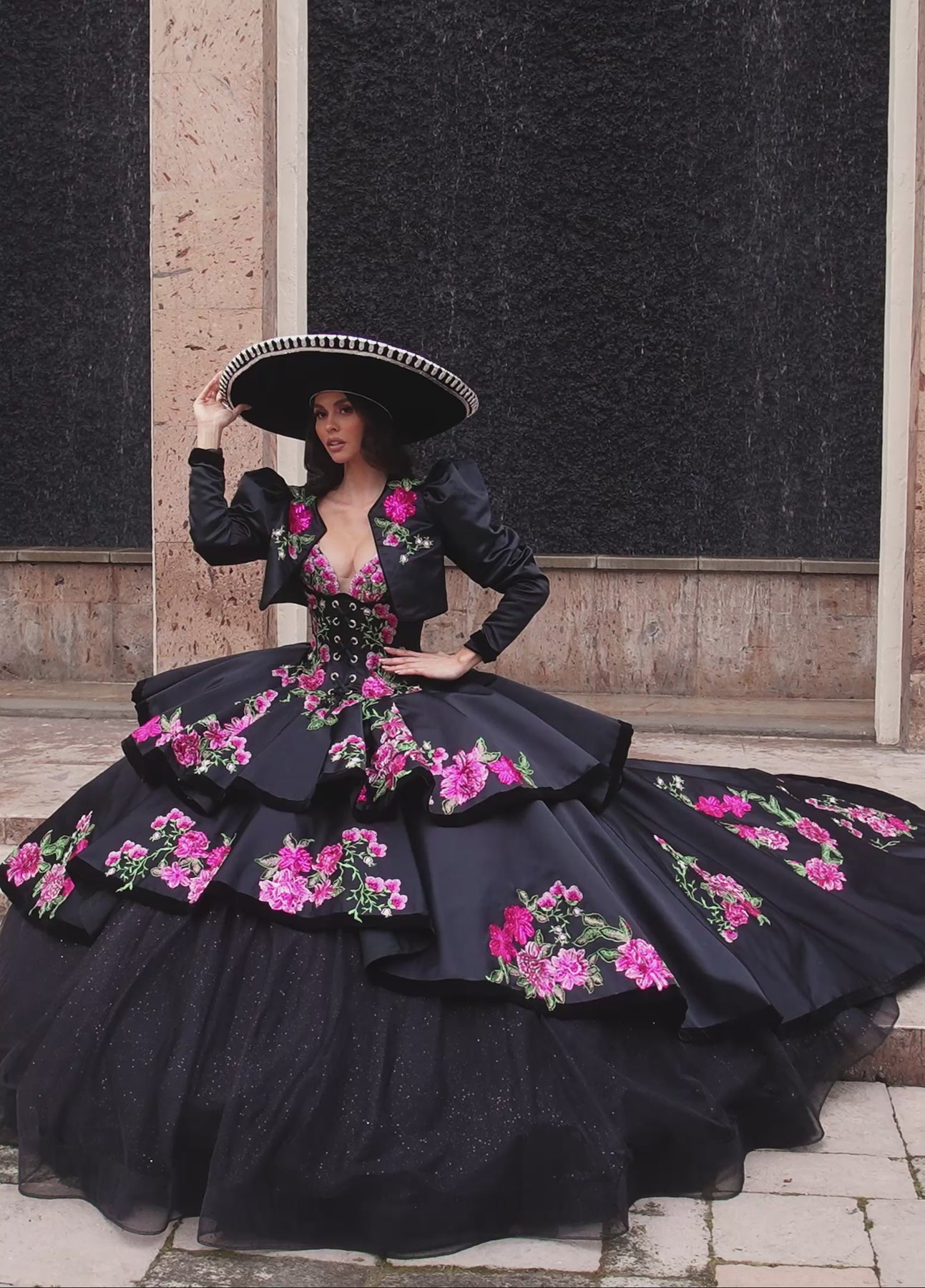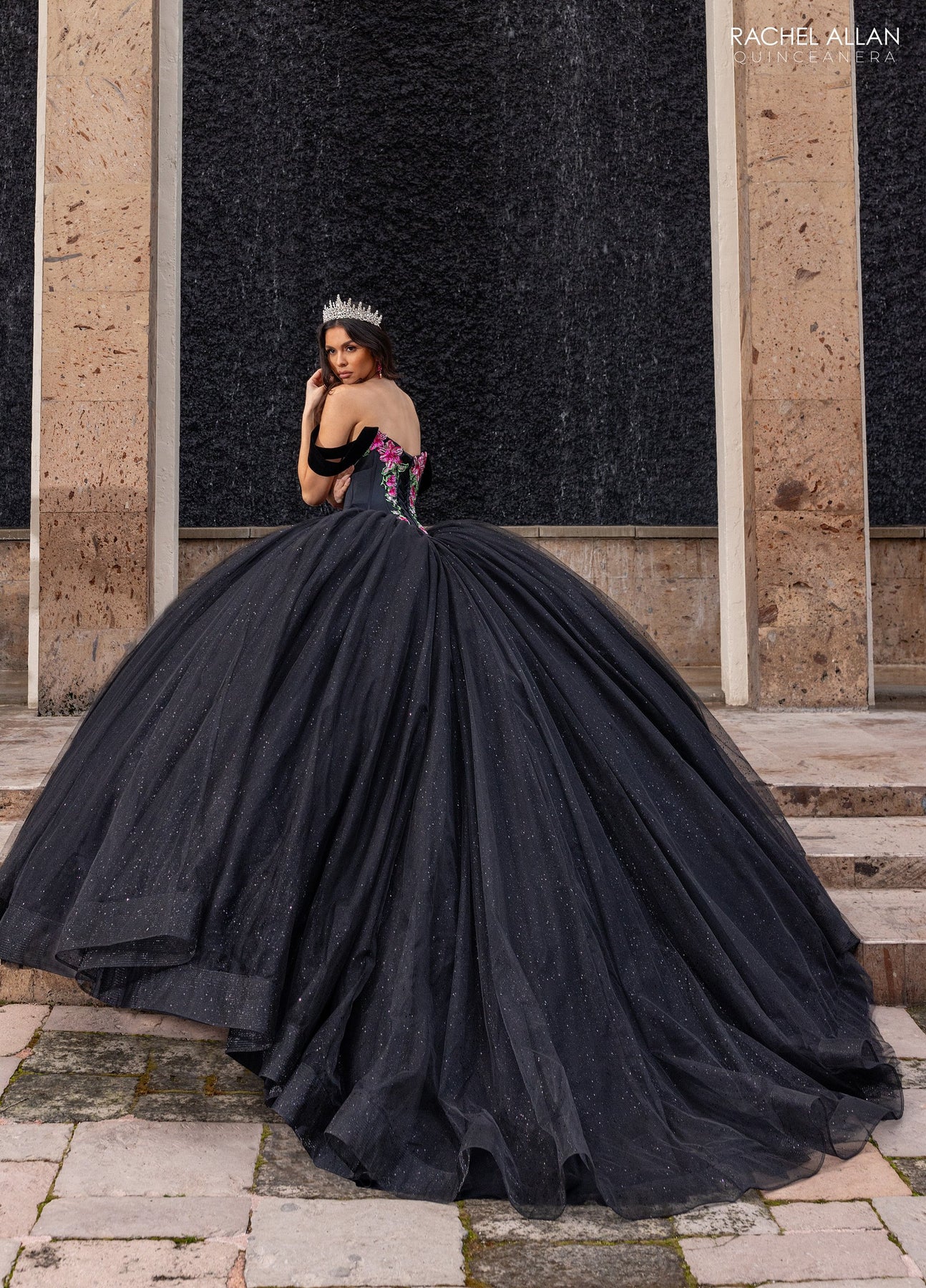 Step into the spotlight with the Rachel Allan RQ5016 Dress, designed to steal the show in Black Multi, White Multi, or Navy Multi. This playful gown dazzles with bold floral sequin appliqués and a voluminous tiered skirt layered over shimmering glitter tulle. Crafted from luxe satin and velvet, it features a detachable corset overlay, jacket, and straps—perfect for turning heads at charro-themed quinceañeras and festive celebrations alike. Make every moment unforgettable in this stunning statement piece.