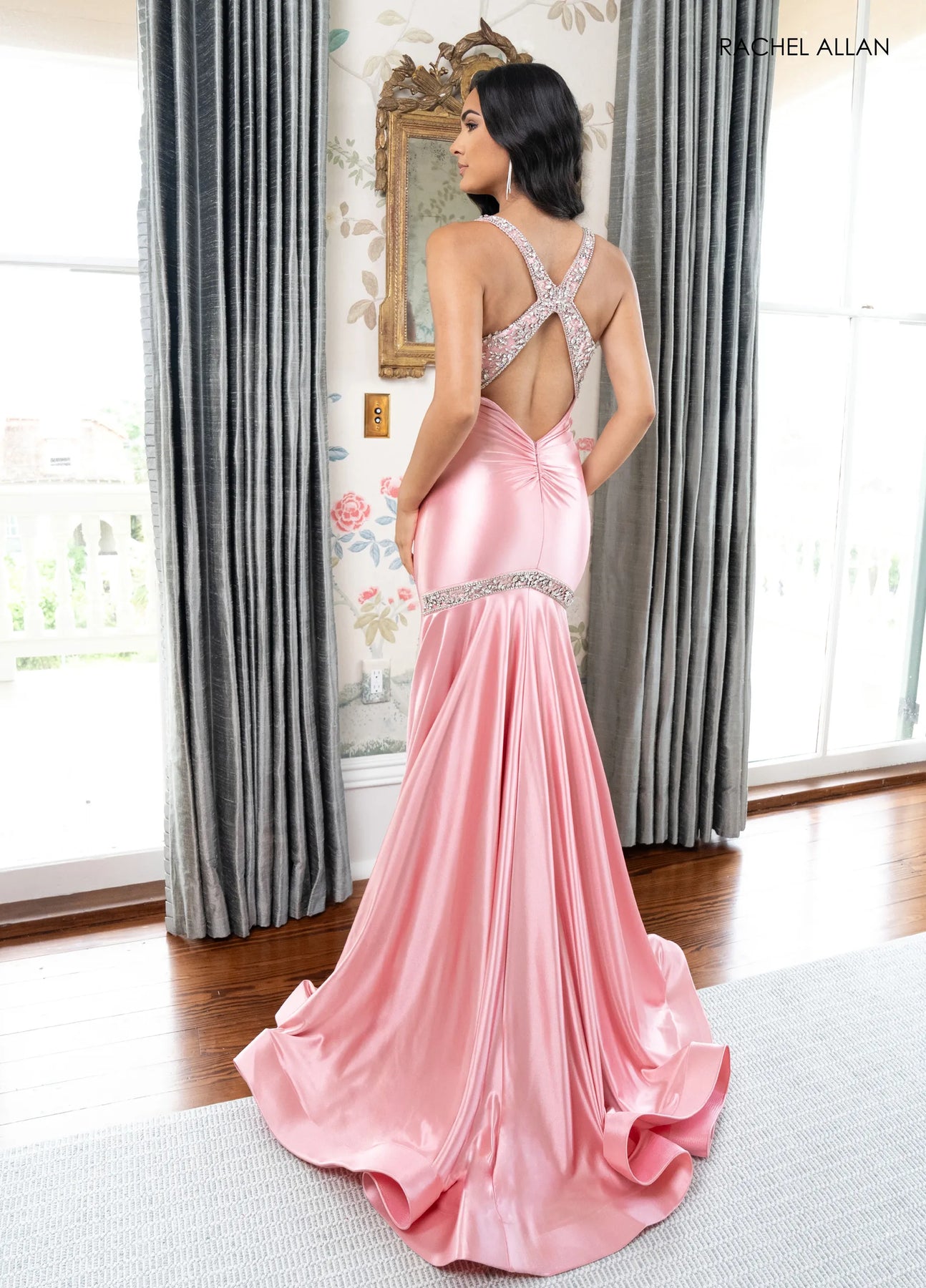 Sculpted to perfection, the Rachel Allan 70932 dress captivates with its luxurious stretch satin jersey and crystal-beaded straps that frame the shoulders beautifully. The striking X-back detail adds dramatic flair, while the fit-and-flare silhouette celebrates your curves before flowing into an elegant train. Select from Champagne for understated sophistication, Yellow for radiant warmth, Cloud Blue for serene confidence, or Rose Pink for timeless romance. Perfect for pageants, proms, and unforgettable celebrations where you deserve to shine.
