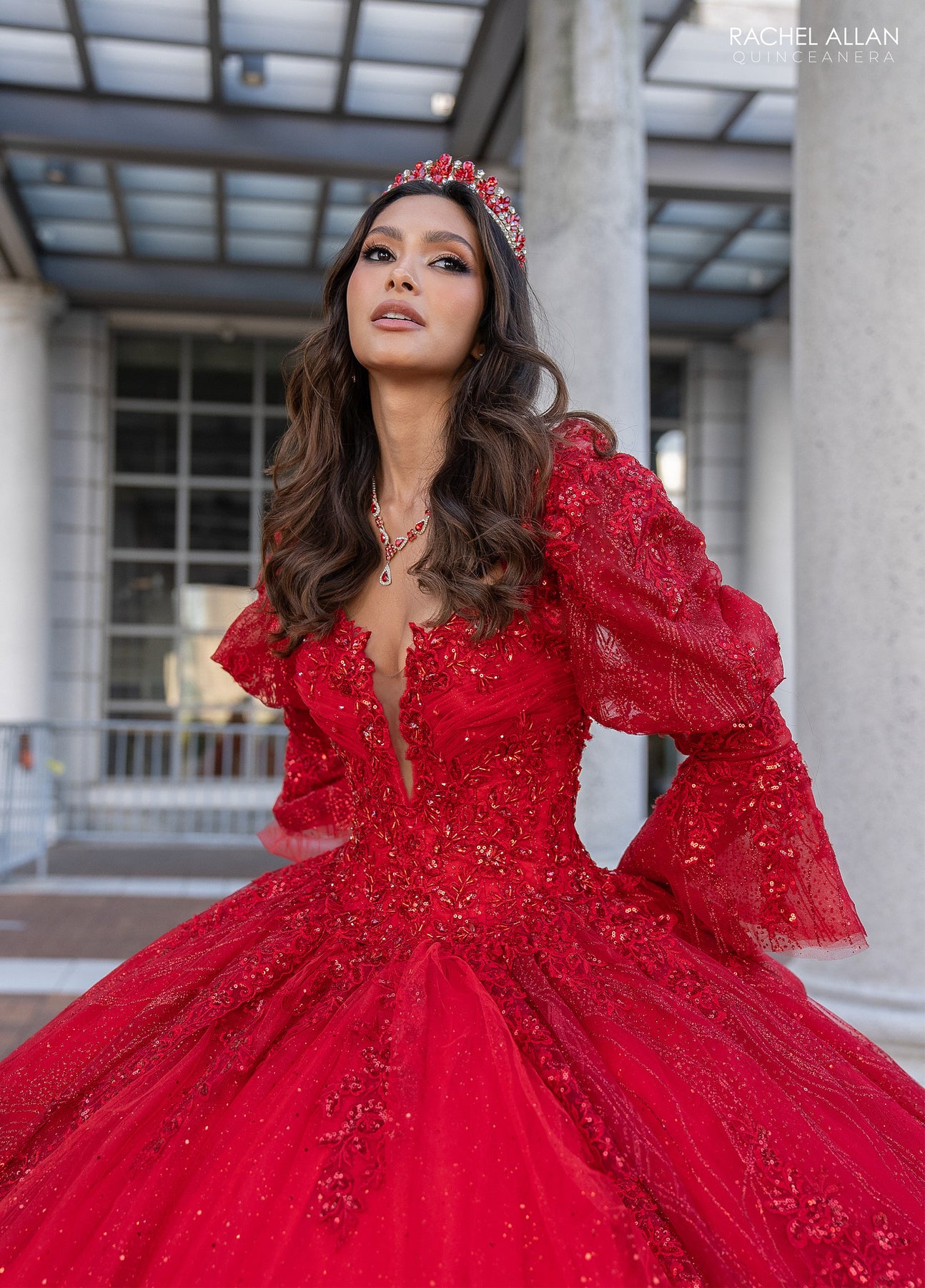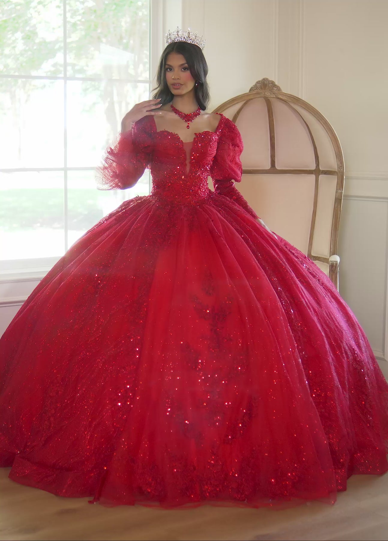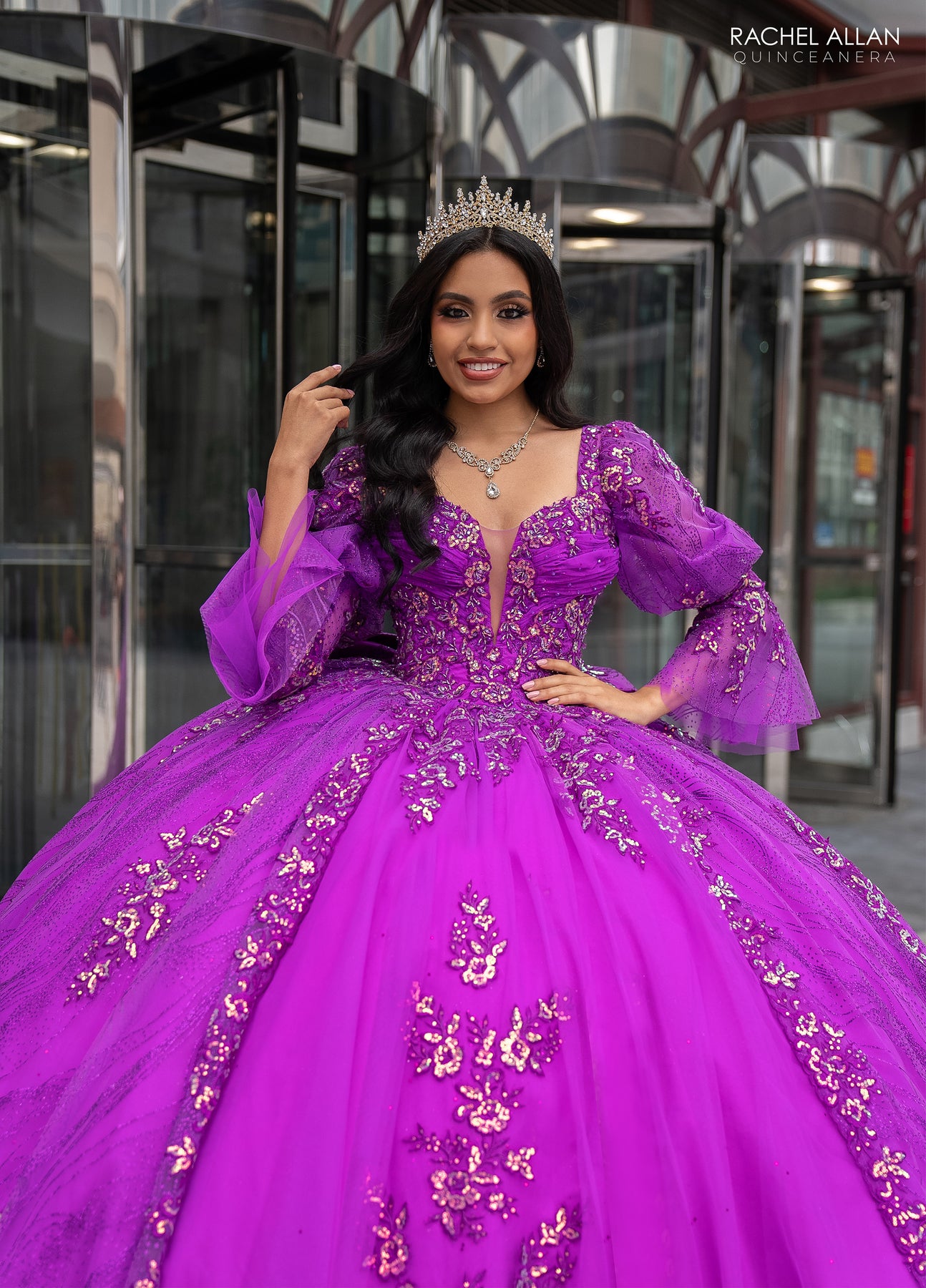 Make your Quinceanera unforgettable with the Rachel Allan RQ1135 Dress! This glittering tulle ball gown dazzles with intricate applique and beading that catch every eye. Detachable 3/4 bubble sleeves offer versatile coverage, and the peek-a-boo back with lace-up detail adds a playful, unexpected twist. Step into sparkle and glamour that will have everyone talking all night long!