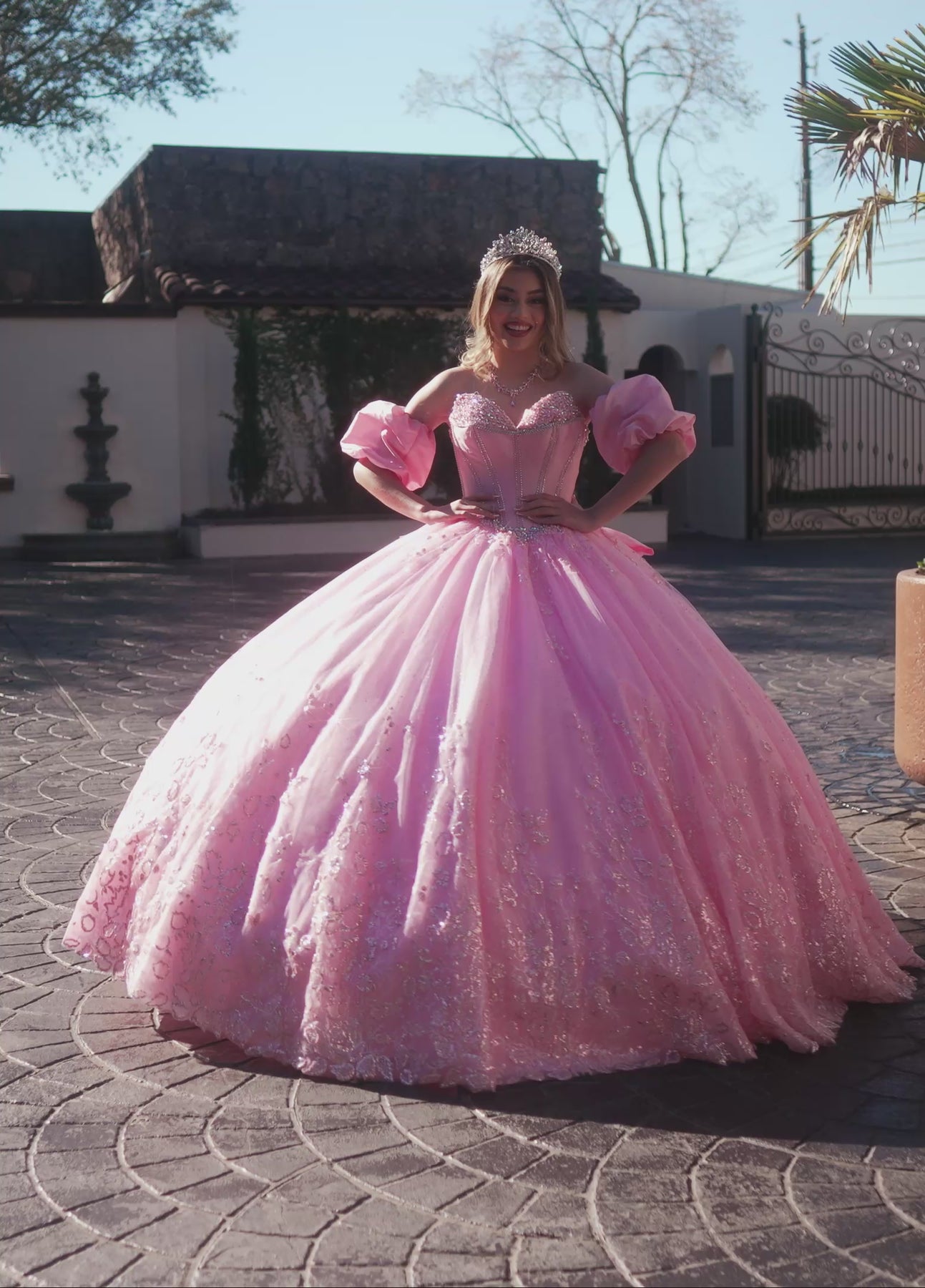 The Rachel Allan RQ1142 Dress brings a playful fairy-tale vibe with its soft hue and delicate details. It features an off-the-shoulder neckline with charming puff sleeves, a sparkling bodice of beads and sequins, and a full tulle skirt accented by subtle floral embroidery. This gown is made for a quinceañera ready to feel like royalty on her big day.