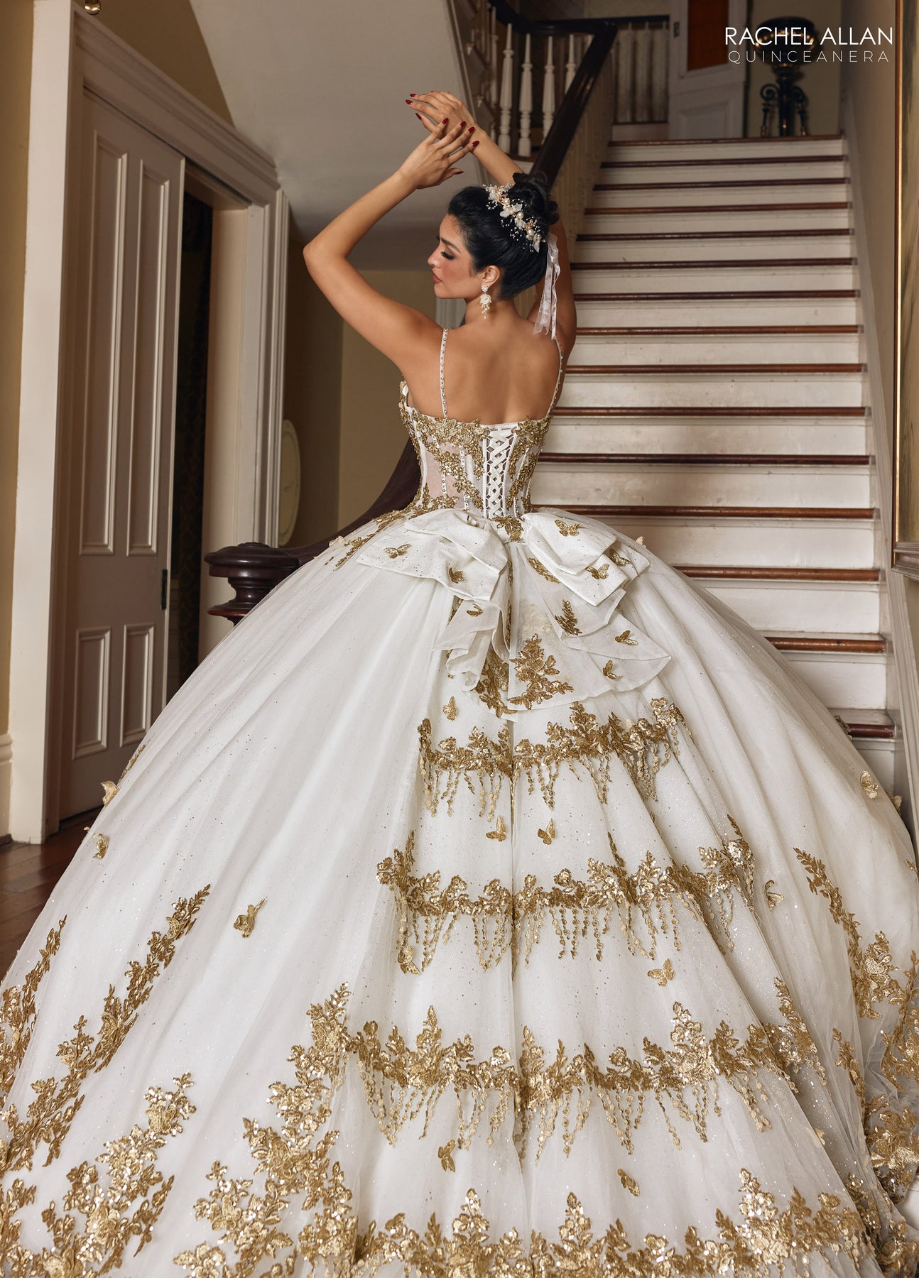 Step into the spotlight with the Rachel Allan RQ1158 Dress, a playful blend of luxury and charm. Choose blush gold or ivory gold to shine in a glittering tulle skirt that moves with magic. Golden embroidery, beads, and delicate appliqués bring royal flair, while 3D butterflies and embroidered fringe add delightful whimsy. The structured bodice with delicate straps and a detachable liner lets you switch up your style, and a large, detachable bow at the back seals the look with a fun, elegant flourish. Perfect for making unforgettable memories!