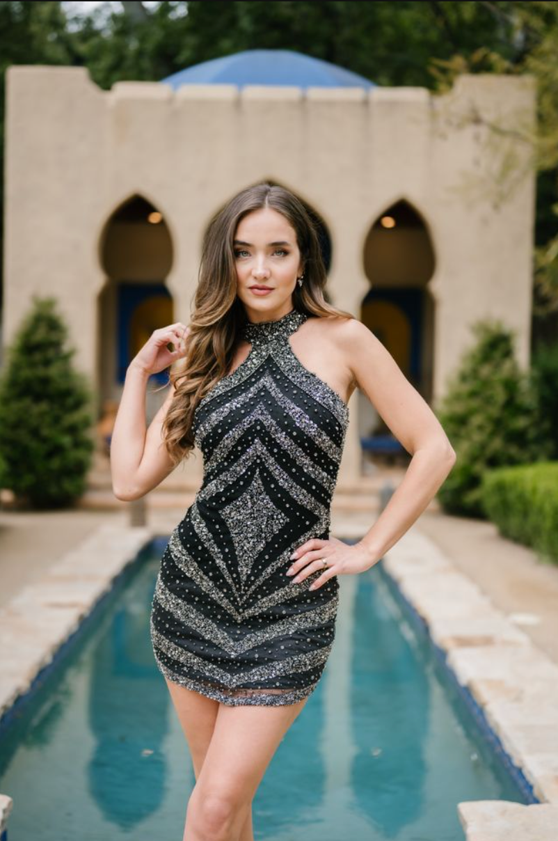 The Aleta 1308 Dress combines elegance and allure with its sleeveless, high-neck design adorned with delicate beads. This short dress offers a perfect balance of sexy and cute, making it an ideal choice for making a striking impression at any event.