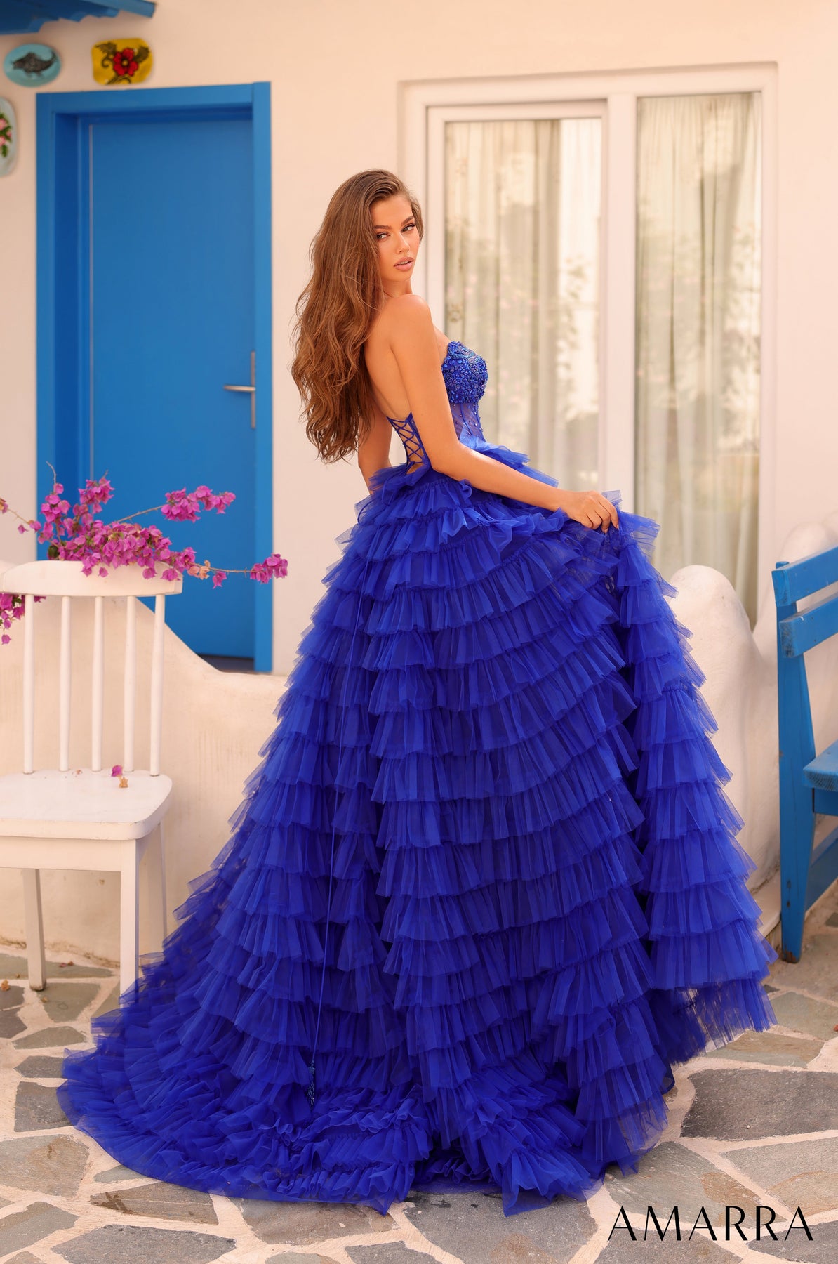 Turn heads in the Amarra 88297 Dress, a playful strapless ball gown that captures the spotlight with its straight neckline and sparkling beaded corset bodice. Layers of tiered ruffles in soft tulle create a fun, voluminous skirt that dances with every step. The lace-up back ensures a flawless fit, perfect for twirling through proms, galas, or any event where you want to shine. Embrace elegance with a dash of whimsy in this floor-length showstopper.