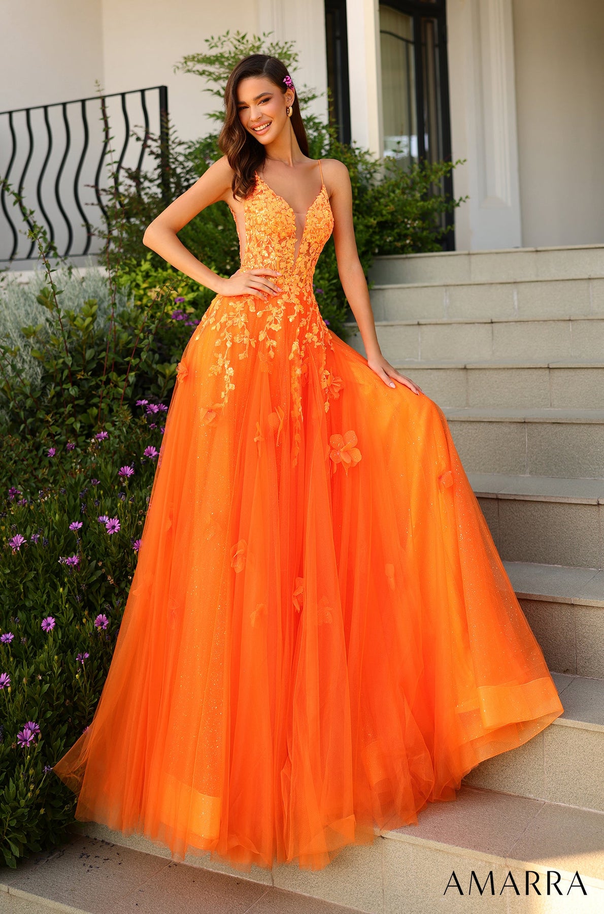 Experience the magic of the Amarra 88857 Dress, designed to make you feel like a star. Crafted from glitter tulle, it features an illusion plunge V-neckline and a sheer boned corset bodice with delicate leaf-shaped sequin appliques. The A-line skirt is enhanced with 3D floral tulle accents, creating a dreamy, whimsical look. Spaghetti straps, a graceful V-back, and a sweep train add sophistication, ensuring you shine with confidence and elegance at your special event.