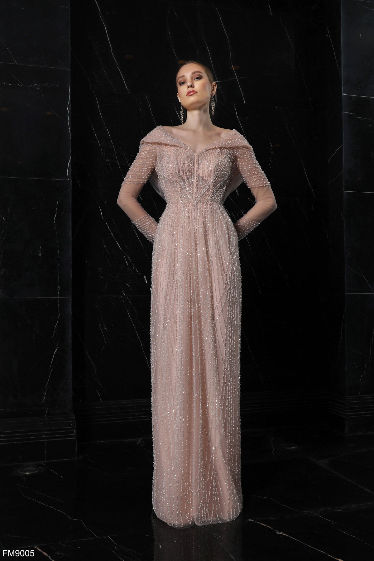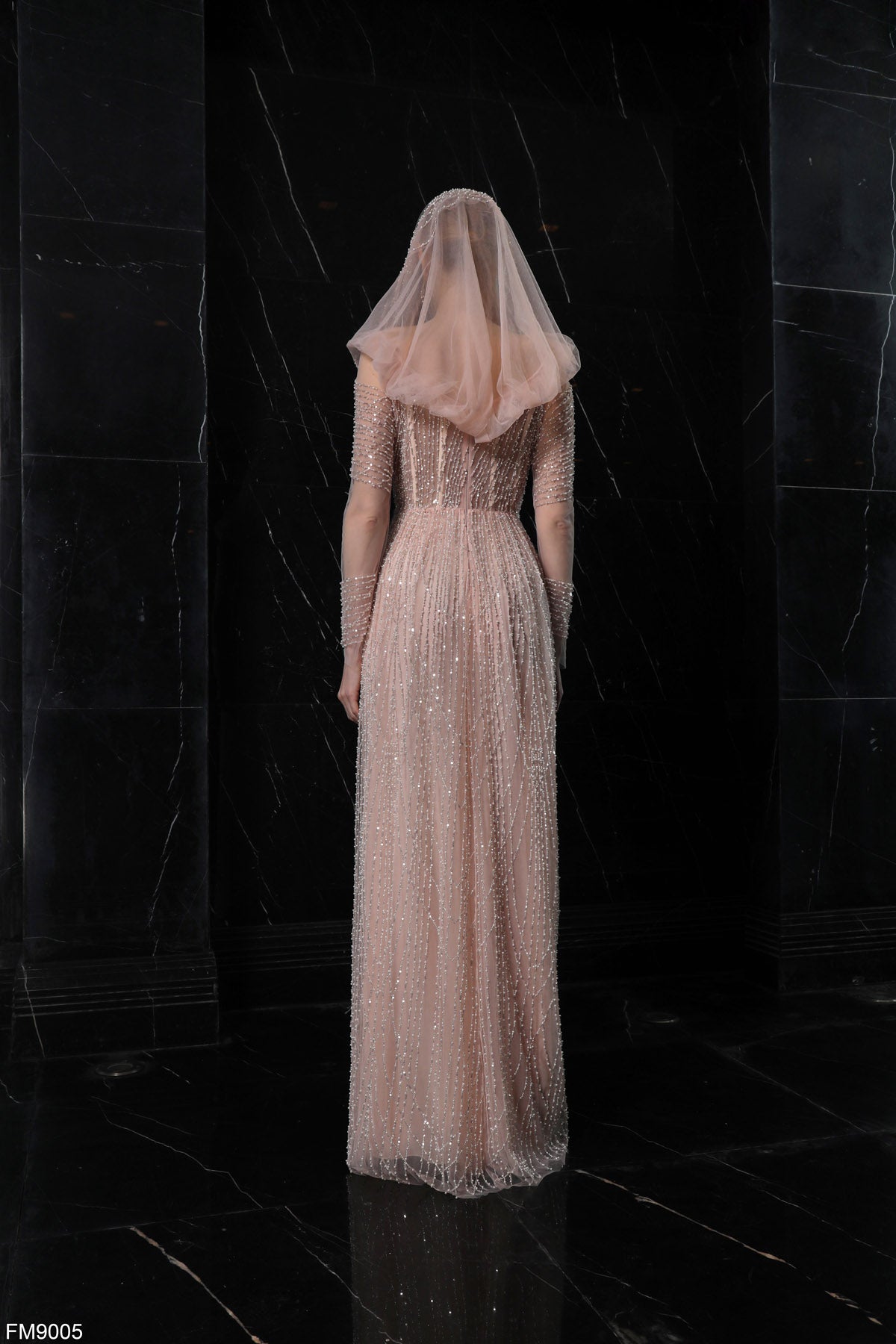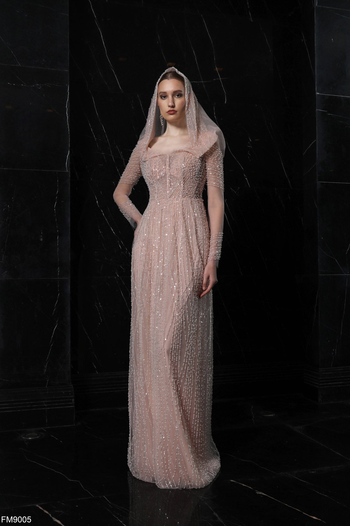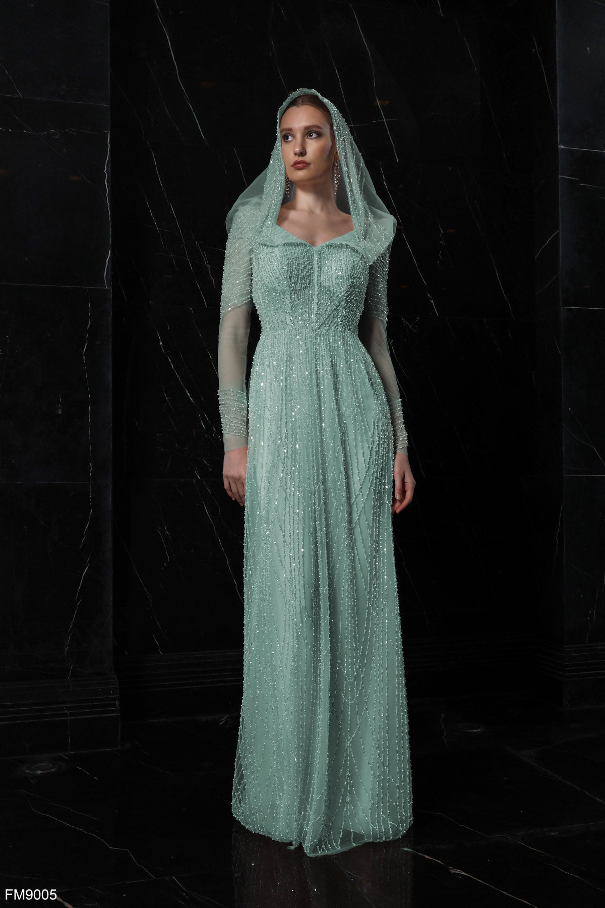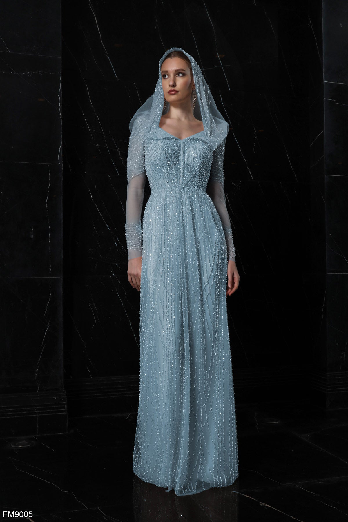The AZZURE COUTURE FM9005 dress in the image is an elegant, floor-length gown in a shimmering, icy blue color. It features a fitted bodice with a sweetheart neckline and long, sheer sleeves adorned with sparkling embellishments. The fabric appears to be lightweight and delicately pleated, giving it a flowing, ethereal effect. A matching sheer hood or veil drapes over the model’s head, adding a touch of medieval or fairytale-like elegance. The overall look is sophisticated and regal, reminiscent of a fantasy or couture gown.