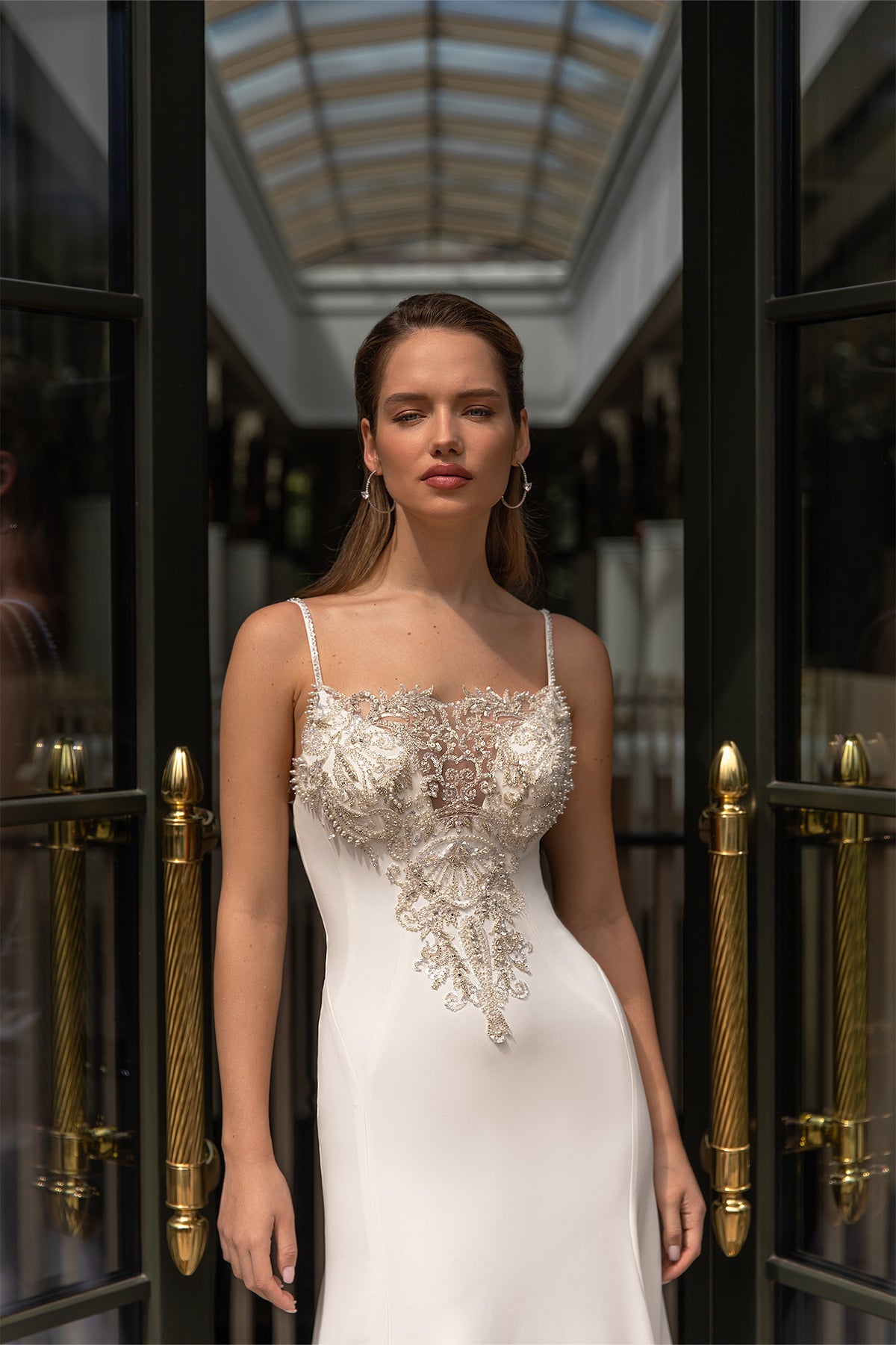 The Maria Anette 5340 Dress is a daring bridal gown featuring a square neckline framed by sheer tulle panels and an intricately embroidered, beaded bodice. Sheer bishop sleeves add volume and elegance, while the flowing A-line skirt with a sheer tulle overlay creates a graceful silhouette. A delicate bow waist tie adds a bold yet feminine finishing touch.