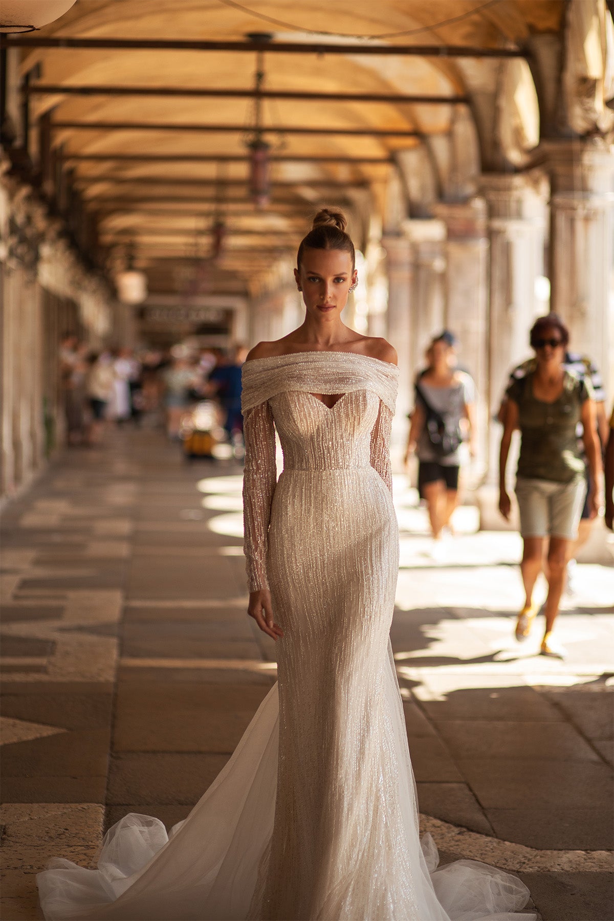 The MARIA ANETTE 5437 Dress is a daring masterpiece featuring an off-shoulder neckline and a sleek Mermaid silhouette that highlights your curves. Sheer fitted sleeves embellished with intricate beading add a touch of sparkle, while a huge top back bow creates a dramatic, unforgettable statement. This gown is perfect for a bride who wants to combine elegance with bold flair.