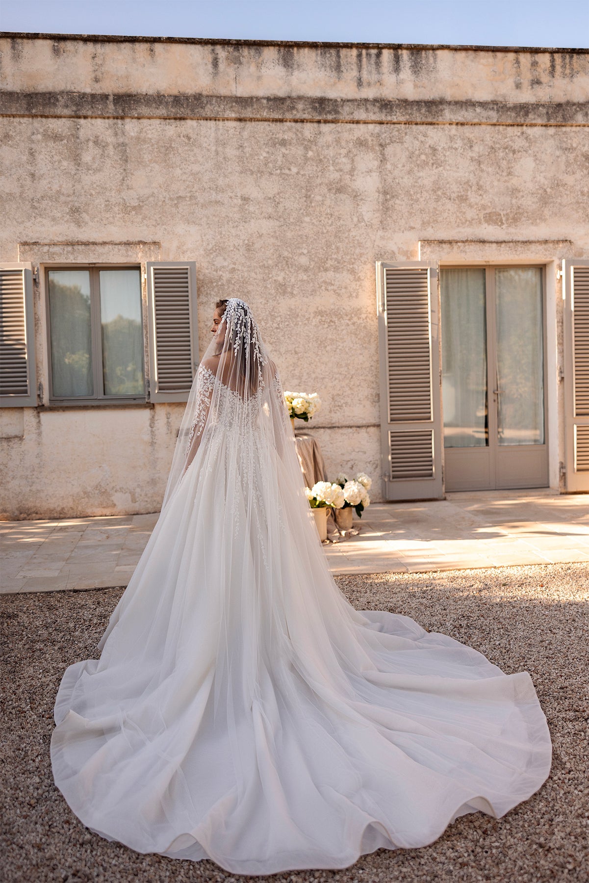 Welcome the Maria Anette 5806—where vintage charm meets modern bridal magic. This captivating gown showcases a flattering V neckline and elegant sleeves that add a touch of sophistication and coverage. The flowing extension creates graceful movement with every step, while the long silhouette ensures you'll feel like the most elegant version of yourself. Ideal for the bride seeking a blend of classic romance and contemporary style, this dress delivers timeless beauty with just the right amount of playful personality.