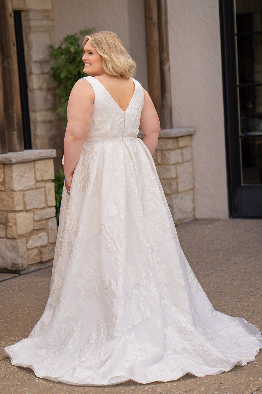 Celebrate your curves in this stunning jacquard brocade gown designed with you in mind. The elegant A-line silhouette flatters with a faux surplice pleated bodice and bra-friendly straps for comfort and confidence. A detachable belt featuring an oversized bow adds a glamorous finishing touch, while box pleats and a graceful slit enhance movement. The chapel train creates a dramatic entrance, and the fully lined construction ensures a polished look from every angle. Perfect for your special day.