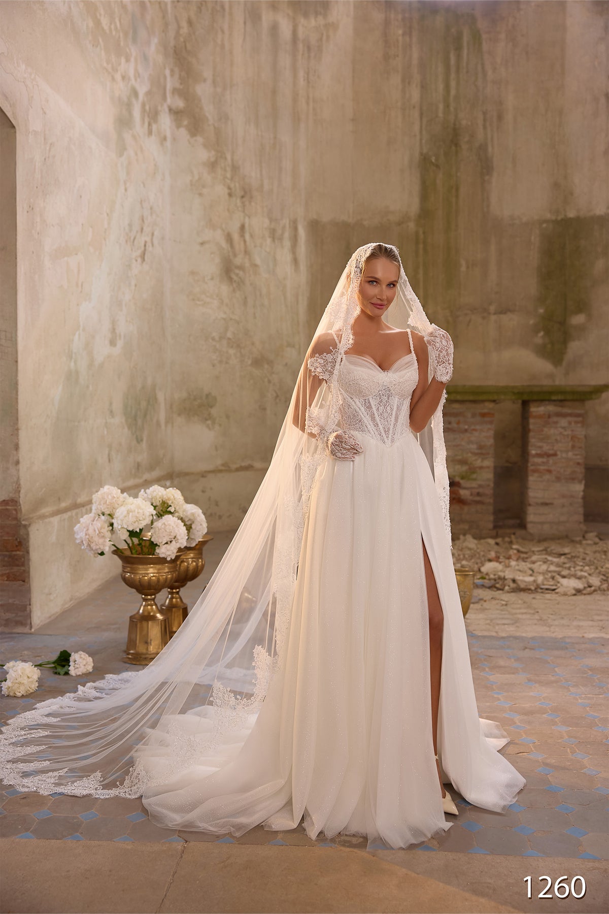 Discover timeless elegance with the Vissaria 1260 Dress, a stunning bridal gown designed to make you feel confident and beautiful on your special day. This exquisite dress features a romantic sweetheart neckline paired with an intricate sheer lace corset bodice that flatters your silhouette. The graceful A-line skirt flows effortlessly, while a daring high leg slit adds modern sophistication. Complete your enchanting look with the included cathedral-length lace veil, creating a breathtaking ensemble that celebrates your unique style and grace.