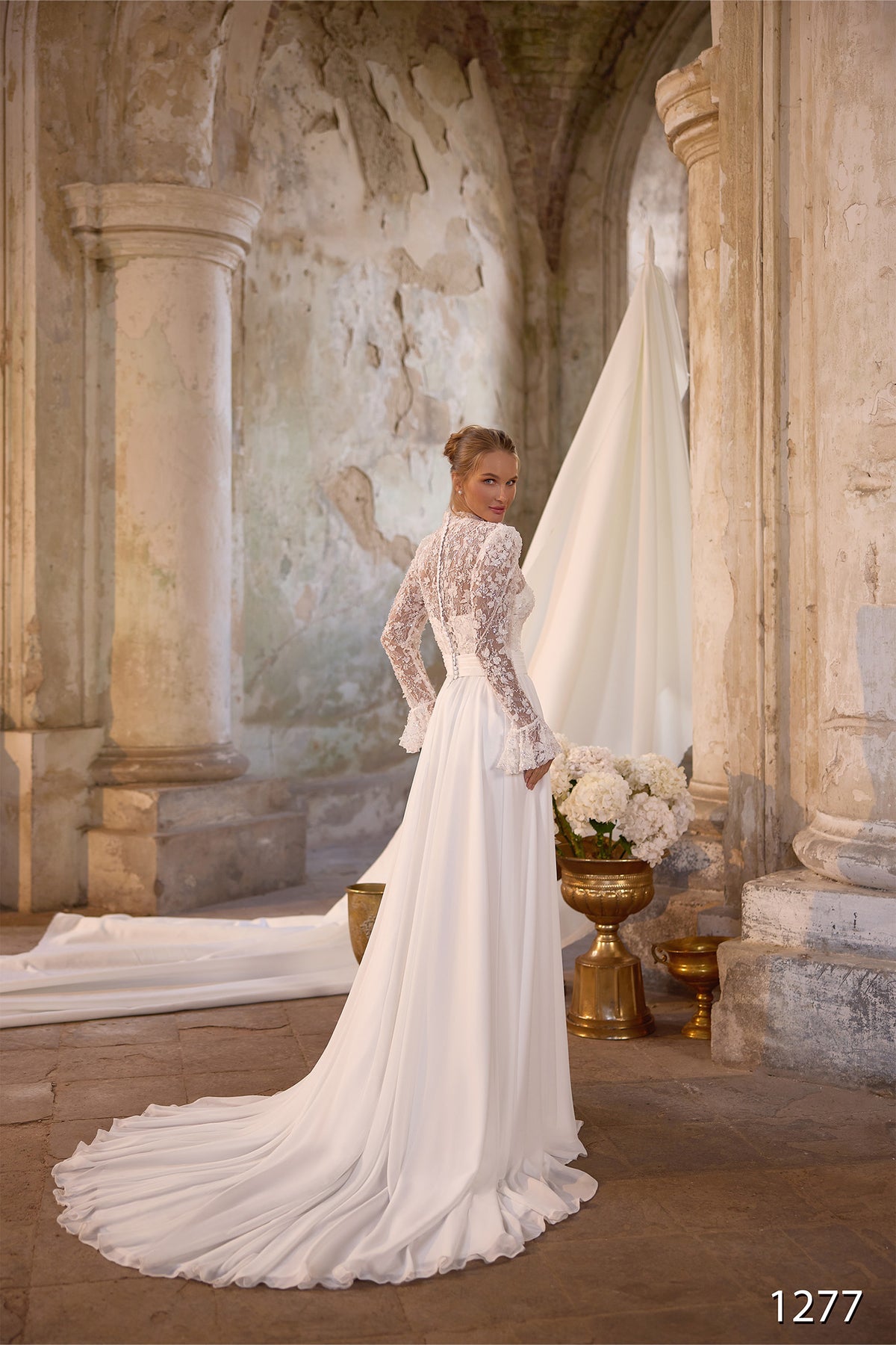 The Vissaria 1277 Dress is an elegant bridal choice that combines timeless sophistication with modern allure. This stunning gown features a graceful high neckline that frames the face beautifully, while long sleeves provide refined coverage and a touch of classic romance. The dramatic high slit adds contemporary flair and movement, allowing you to walk with confidence on your special day. Crafted with bridal elegance in mind, this dress celebrates your unique style while offering the comfort and support you deserve as you celebrate one of life's most meaningful moments. Perfect for the bride who wants to make a memorable entrance.