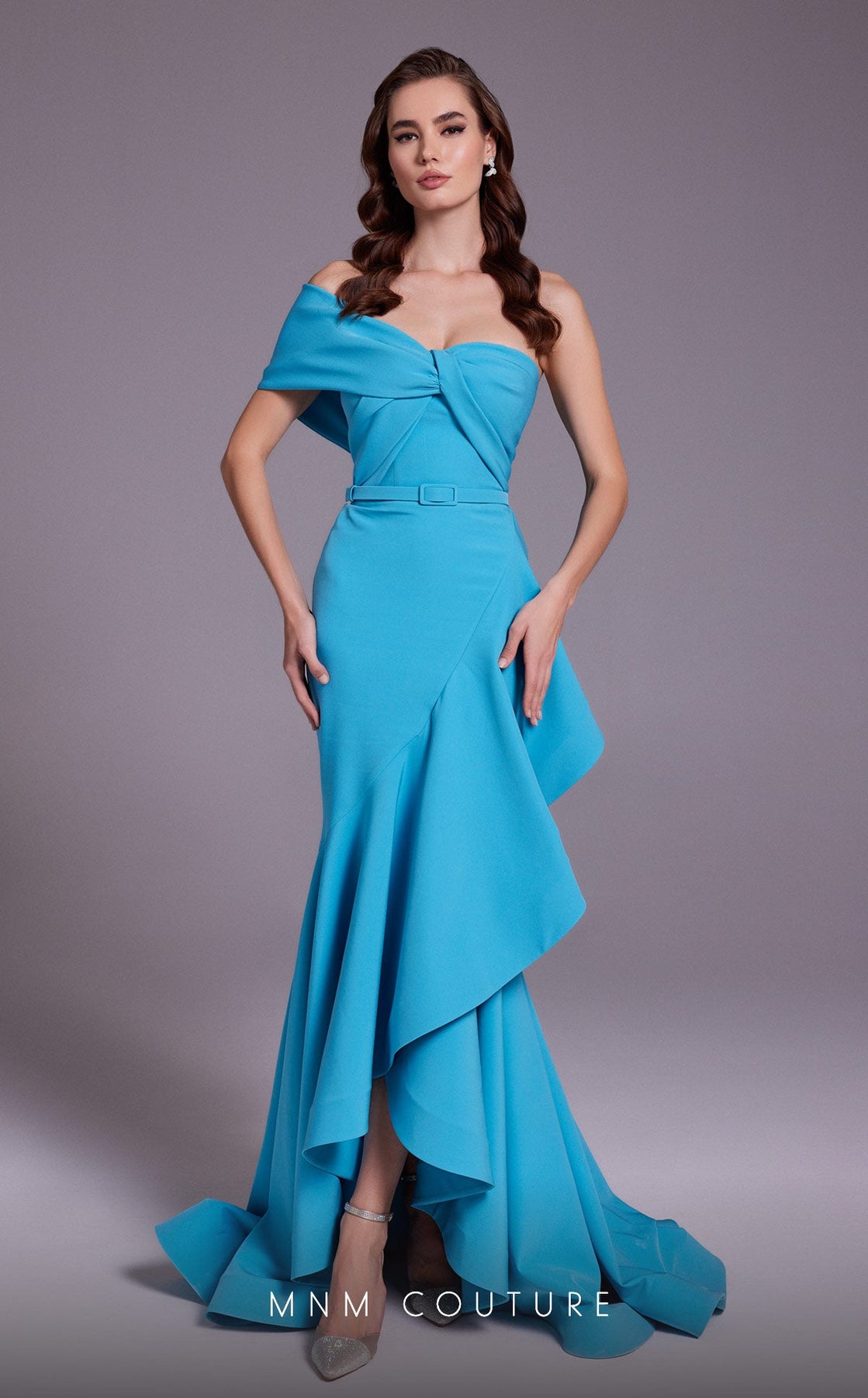 The NF by Nour N0546 Dress captivates with its strapless crepe bodice and elegant one off-shoulder sleeve, creating a striking silhouette. A tonal belt defines the waist, while dramatic ruffles and an asymmetrical hem enhance the high-low mermaid design, ensuring you stand out at any event with effortless sophistication.