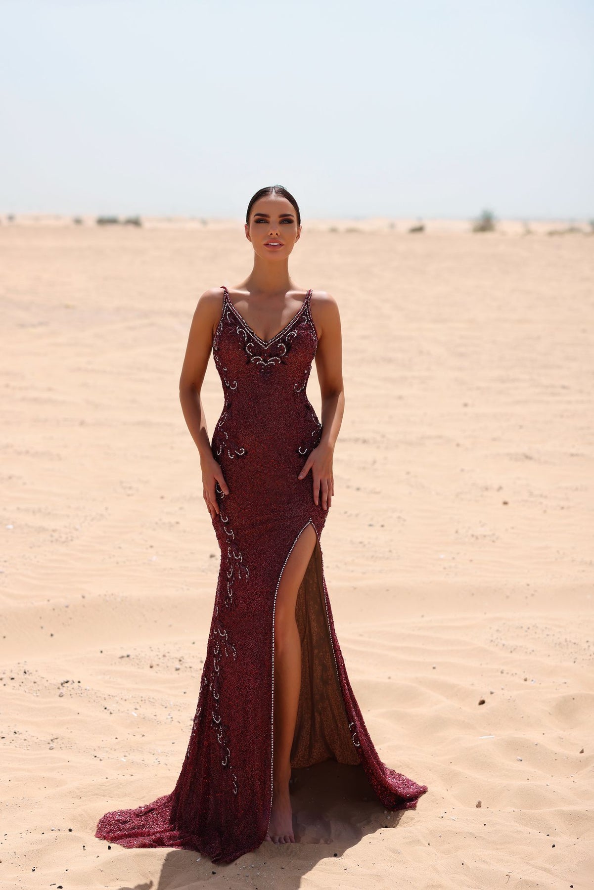 Slip into pure elegance with this show-stopping Chic and Holland gown that's basically a red carpet moment waiting to happen. The plunging V-neckline and daring open back create an irresistibly sultry silhouette, while the high slit adds just the right amount of leg-baring drama. Sleek and sleeveless for maximum impact, this beauty is adorned with intricate beading that catches the light with every move. Perfect for those nights when you want to turn heads and feel absolutely fabulous—because sometimes you need a dress that's as bold and beautiful as you are.