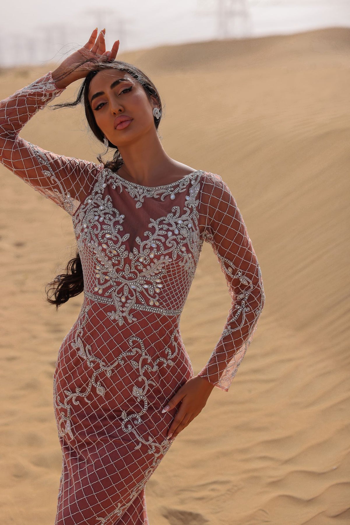 Elevate your evening with this stunning Chic and Holland creation that's pure magic! This long dress features intricate beading that catches the light beautifully, paired with delicate tulle accents for an ethereal touch. The graceful long sleeves add sophistication and elegance, making it perfect for formal events, galas, or those moments when you want to feel absolutely fabulous. The beadwork creates a dazzling effect that'll have everyone asking where you got your dress, while the tulle brings a whimsical, romantic vibe. Whether you're walking the red carpet or turning heads at a special occasion, this dress delivers timeless glamour with a playful edge.