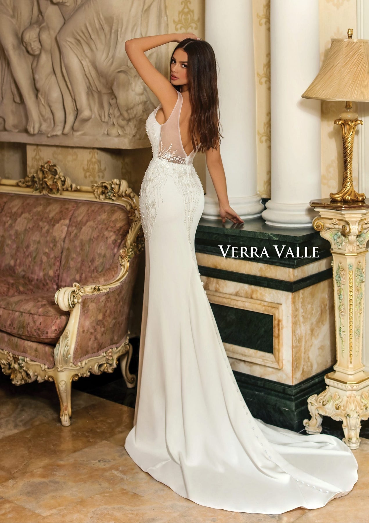 This classic Bridal Gown features a deep V-neckline with a sheer back and delicate lace applique.