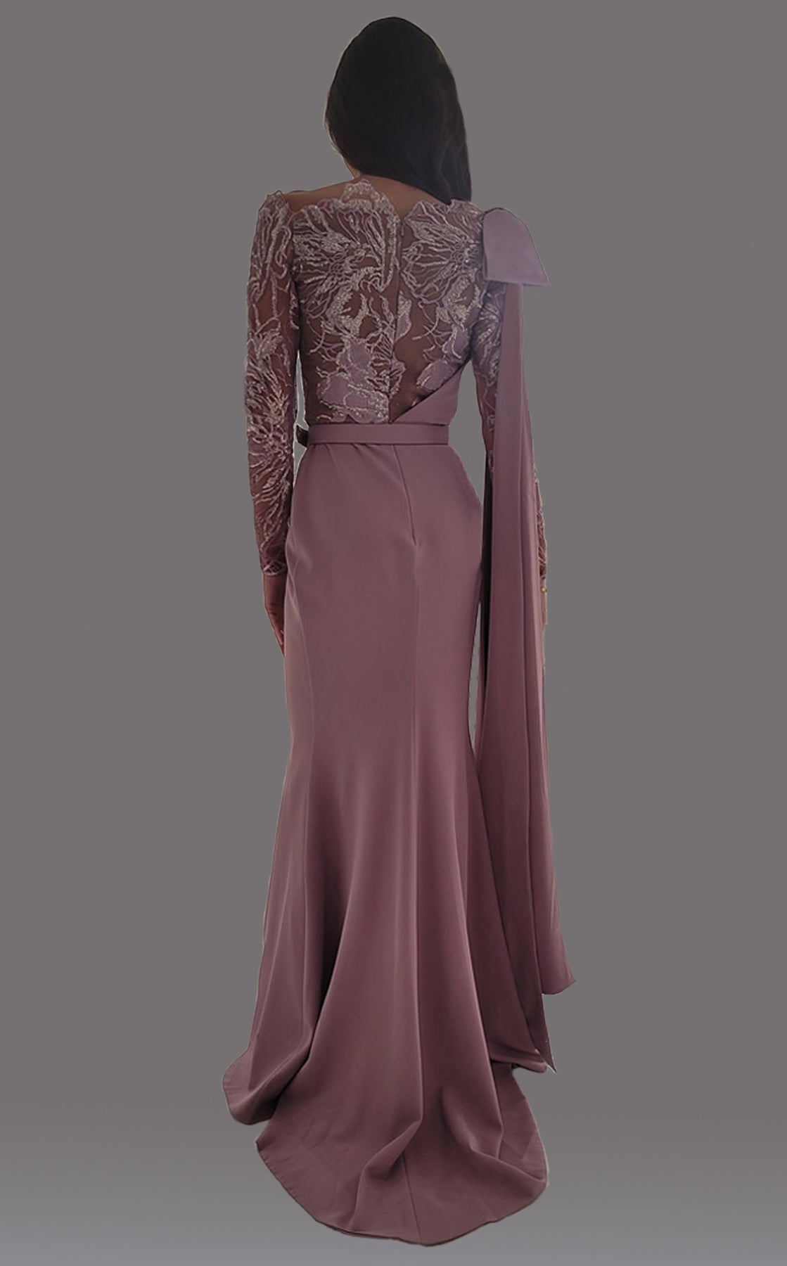 The MNM Couture 2688 is an exquisite long dress that embodies timeless elegance for your most important moments. Crafted from luxurious lace and crepe, this fitted column gown features a sophisticated boat neckline and dramatic cape sleeves that flow gracefully with every step. The dress hugs your silhouette beautifully while a tasteful slit and coordinating belt add refined detail and movement. A sweeping train creates a stunning dramatic effect, while the secure zipper back ensures a flawless fit throughout the evening. Perfect for galas, weddings, and formal celebrations where you want to feel absolutely radiant.