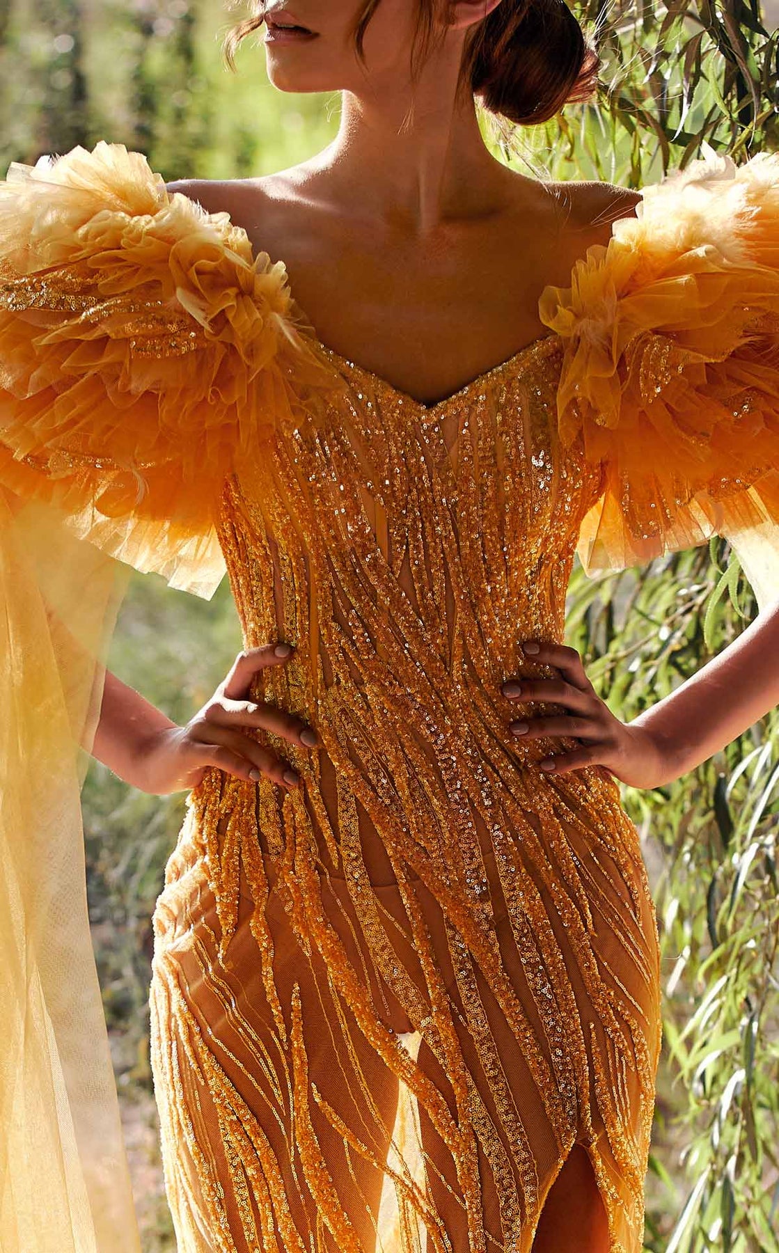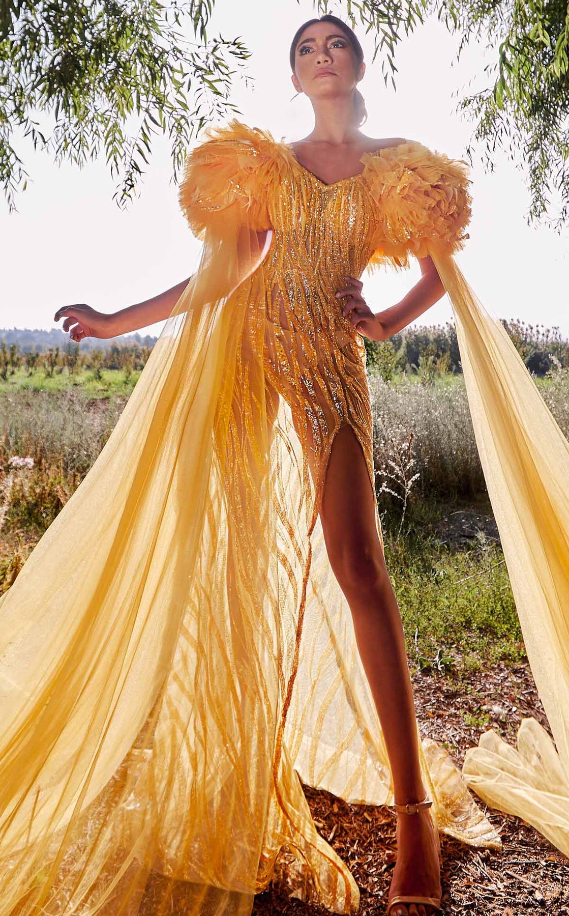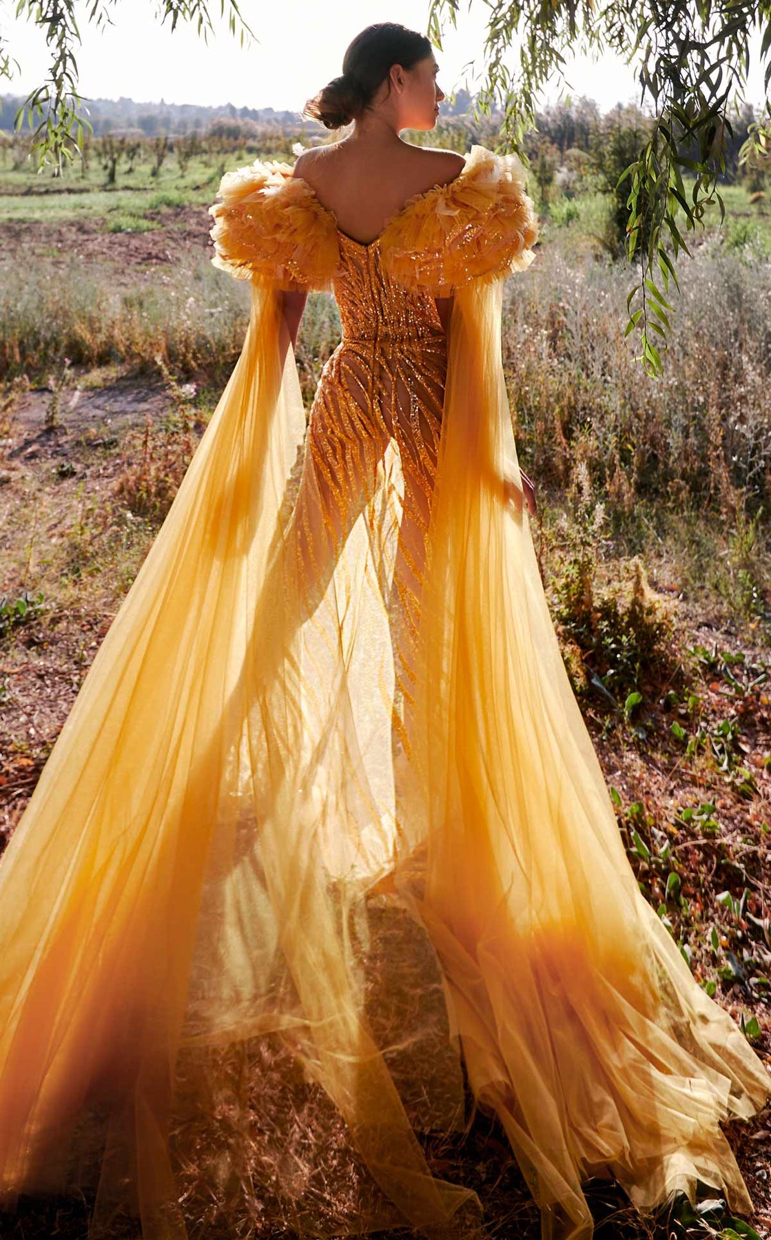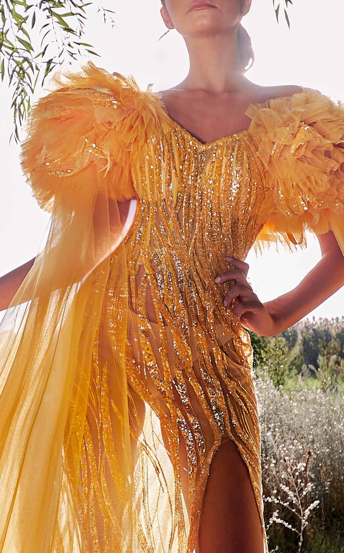 The MNM Couture K3934 is an exquisite long gown that commands attention with its sophisticated silhouette and radiant details. Crafted from luxurious tulle, this fitted column dress features a sweetheart neckline and romantic ruffle sleeves that frame your figure beautifully. Intricate beading and crystals dance across the fabric, creating luminous movement with every step. A daring thigh-high slit and flowing train add dramatic flair, while the concealed zipper back ensures a seamless, polished appearance. Perfect for those special moments when you want to feel absolutely stunning and confident.
