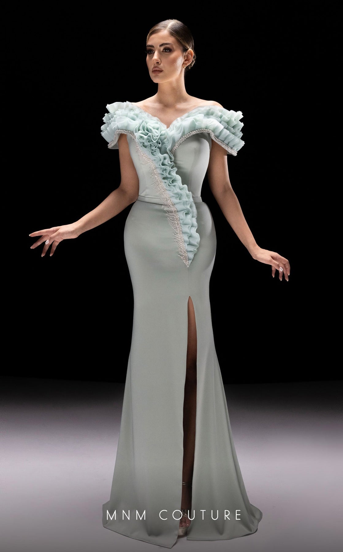 This MNM K4228 dress features an off shoulder design and a high slit for an elegant evening look. The open back adds a touch of sensuality to the dress, making it perfect for formal events. With its long length, you'll be sure to make a statement and turn heads.