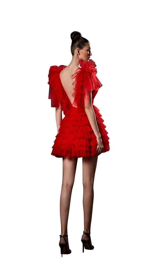 Turn heads in the Ziad Germanos ZG2, where bold meets beautiful. This stunning tulle mini dress features a daring plunging neckline, an open back that's pure seduction, and tiered layers that flow in a flattering A-line silhouette. The sleeveless design and lightweight fabric create an ethereal, floaty feel perfect for making an unforgettable entrance at cocktail parties and exclusive events. Refined glamour meets modern edge—this is the dress that steals the show.
