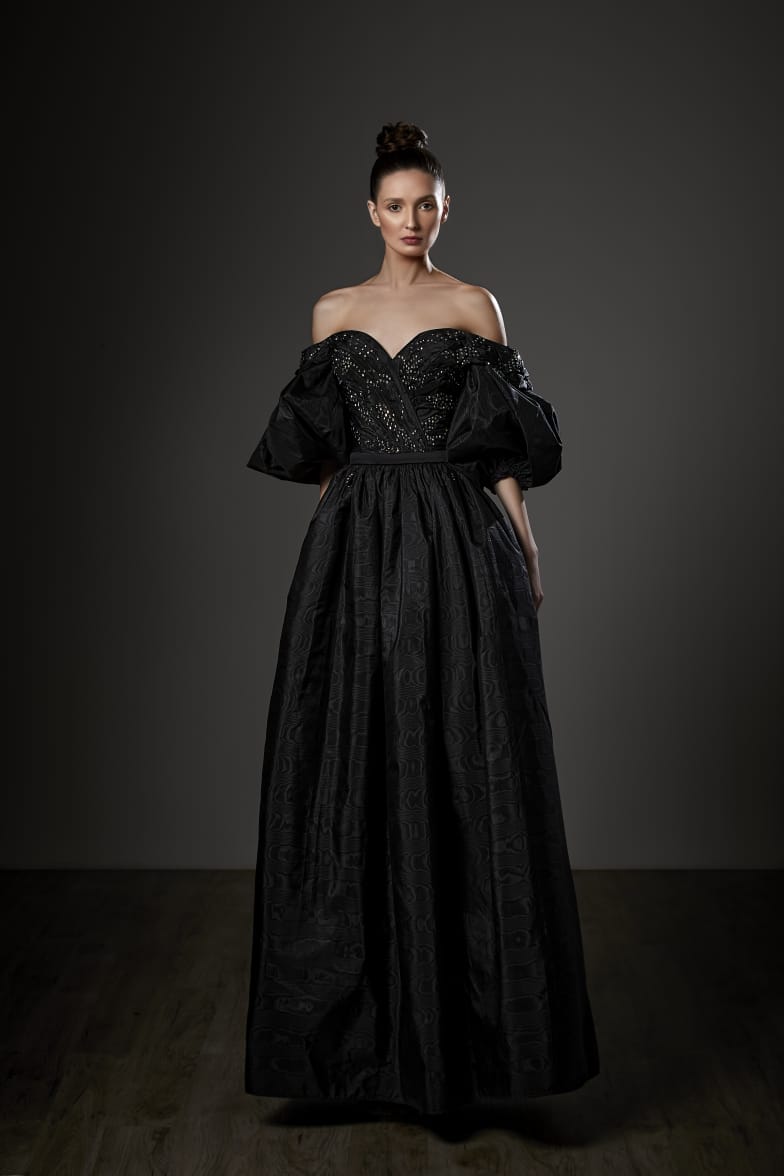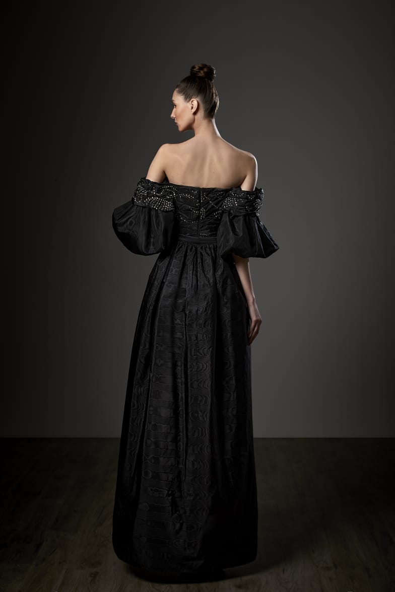 Slip into pure magic with the Ziad Germanos ZG75—where jacquard dreams meet ball gown reality. This show-stopping stunner features an off-the-shoulder sweetheart neckline, playful puff sleeves, and intricate pleating that'll have everyone asking who designed your gown. The long, flowing silhouette glides like you're walking a red carpet, while the back zipper keeps everything perfectly in place. Crafted from luxurious jacquard fabric with couture-level tailoring, this is your ticket to feeling absolutely fabulous at any special occasion. Pure elegance, pure you.