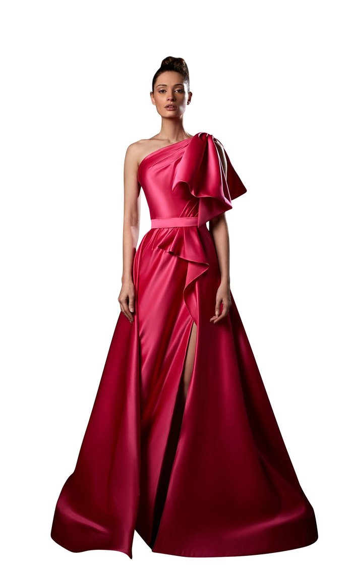 Prepare to turn heads in the Ziad Germanos ZG12—a show-stopping A-line evening dress that's basically a standing ovation waiting to happen. Crafted from luxuriously smooth mikado fabric, this beauty features a chic one-shoulder neckline adorned with a playful bow and romantic ruffles that dance as you move. The full-length silhouette flows into a layered overskirt with a subtle slit for just the right amount of drama and ease. Whether you're the guest of honor or the fabulous mother of the bride, this couture-quality gown delivers comfort and undeniable elegance with its perfectly placed back zipper. Pure magic in fabric form.