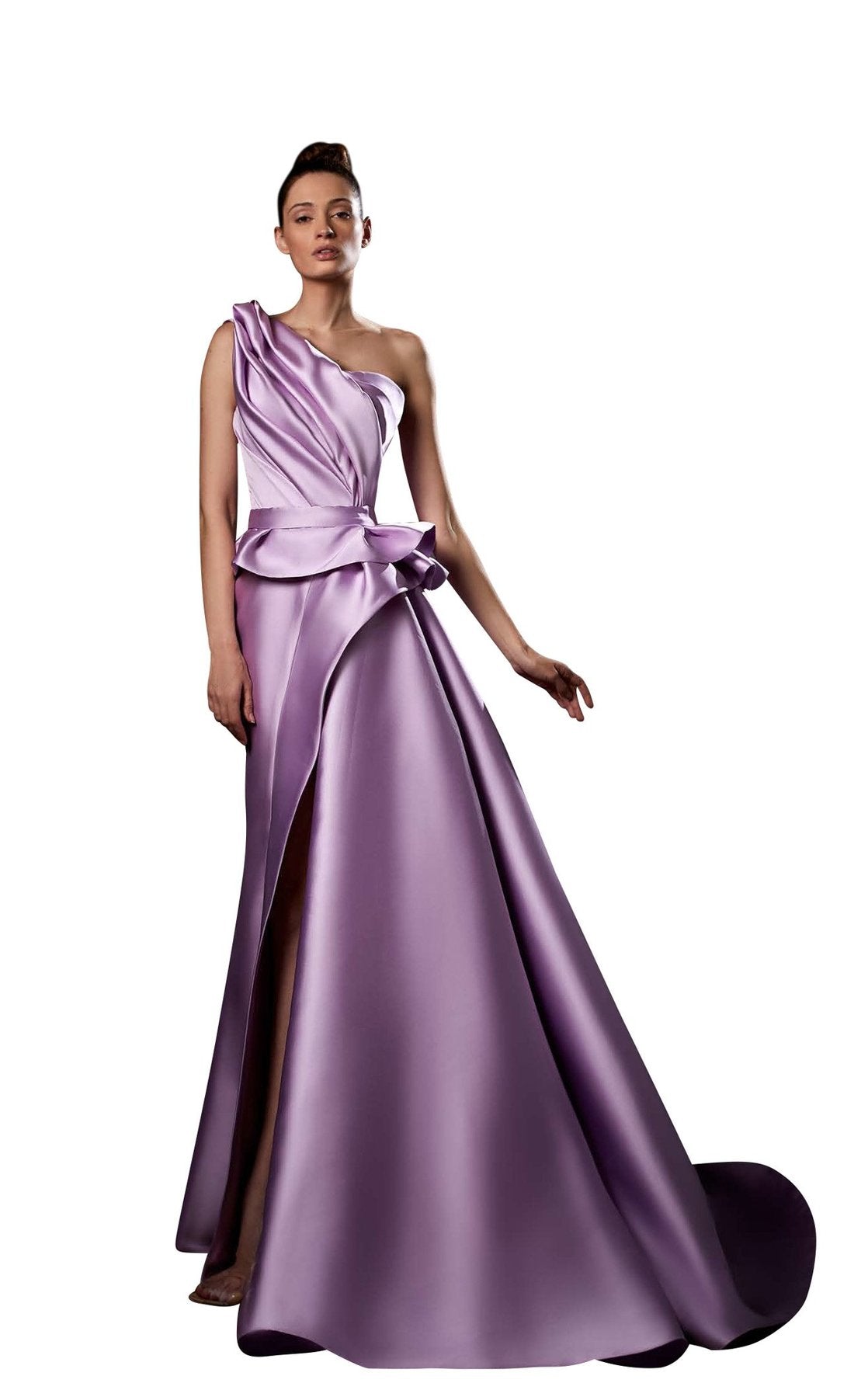 Turn heads in the Ziad Germanos ZG24, where bold design meets timeless elegance. This stunning one-shoulder gown features luxurious Mikado fabric that hugs your curves with a ruched bodice, while a daring front slit and open back reveal just the right amount of allure. The sweeping train flows behind you like pure drama, perfect for making a grand entrance at galas, weddings, or red-carpet moments. Sleek, sophisticated, and unapologetically show-stopping—this is the dress that makes you feel like the main character of your own story.