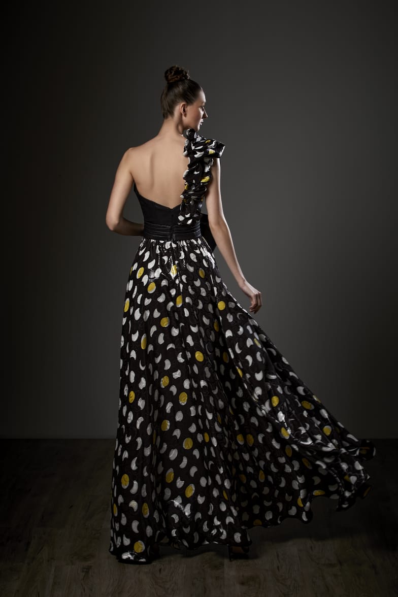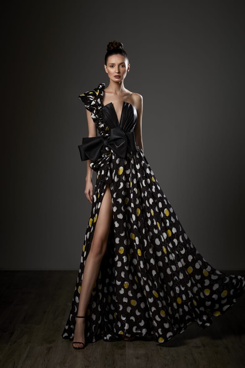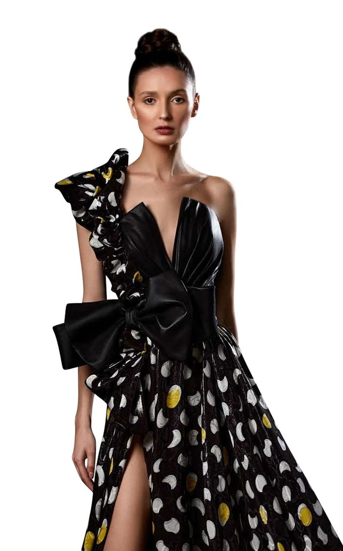Step into the spotlight with the Ziad Germanos ZG76, a show-stopping gown that's equal parts glam and fun. This luxe piece combines shimmering sequins with silky satin, creating a delightful contrast of textures that catches every light. The chic one-shoulder neckline and playful polka-dot pattern give classic elegance a modern wink, while the flowing A-line skirt with a daring slit lets you move with confidence and flair. Finished with a discreet back zipper, this dress wraps you in pure sparkle—because why blend in when you were born to dazzle?