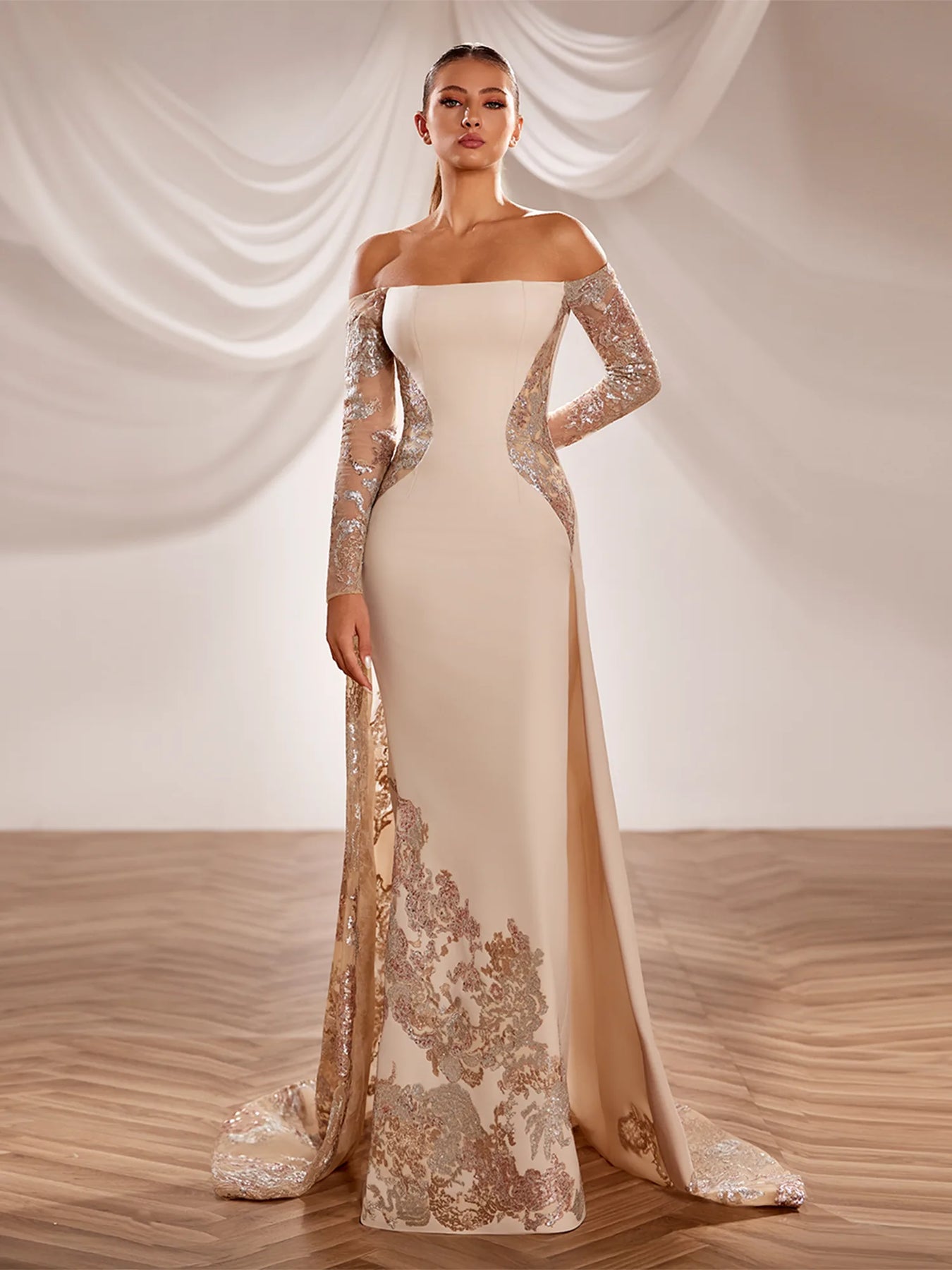 Slip into pure elegance with the Reverie Couture SS237—a dreamy blush crepe gown that whispers sophistication. The flowing crepe fabric drapes beautifully, while delicate sheer embellishments dance across the bodice, adding just the right touch of sparkle and romance. Perfect for those moments when you want to feel absolutely radiant, this gown transforms any occasion into something unforgettable. Timeless, graceful, and utterly enchanting.