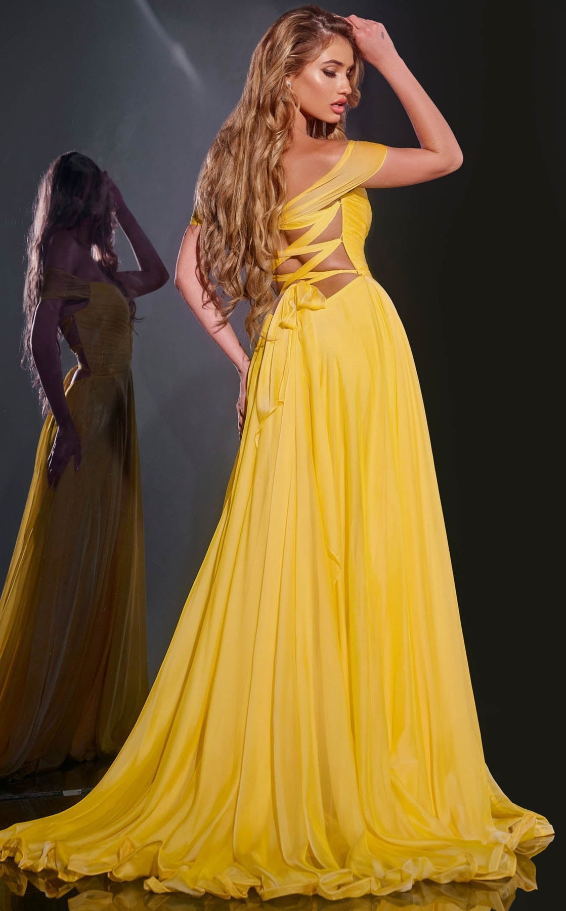 Welcome to sophistication and modern design with the Jovani 43842 Dress. This gown's shirred silhouette, draped off-shoulder sleeves, and structured corset bodice exude elegance, while the lace-up back adds allure. With a flowy A-line skirt and dramatic high slit, this dress is perfect for making a statement and turning heads. Make your grand entrance with Jovani.