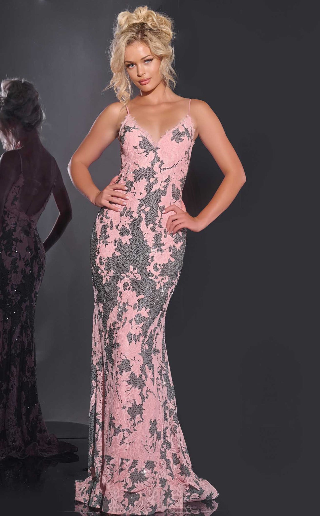 Get ready to enchant the crowd in Jovani 44033, a captivating lace tulle gown. Delicate spaghetti straps and a fitted bodice adorned with 3D floral accents and sparkling rhinestones add depth and radiance. The open back and mermaid silhouette add allure, while the back zipper allows for easy wear. Make an unforgettable statement!