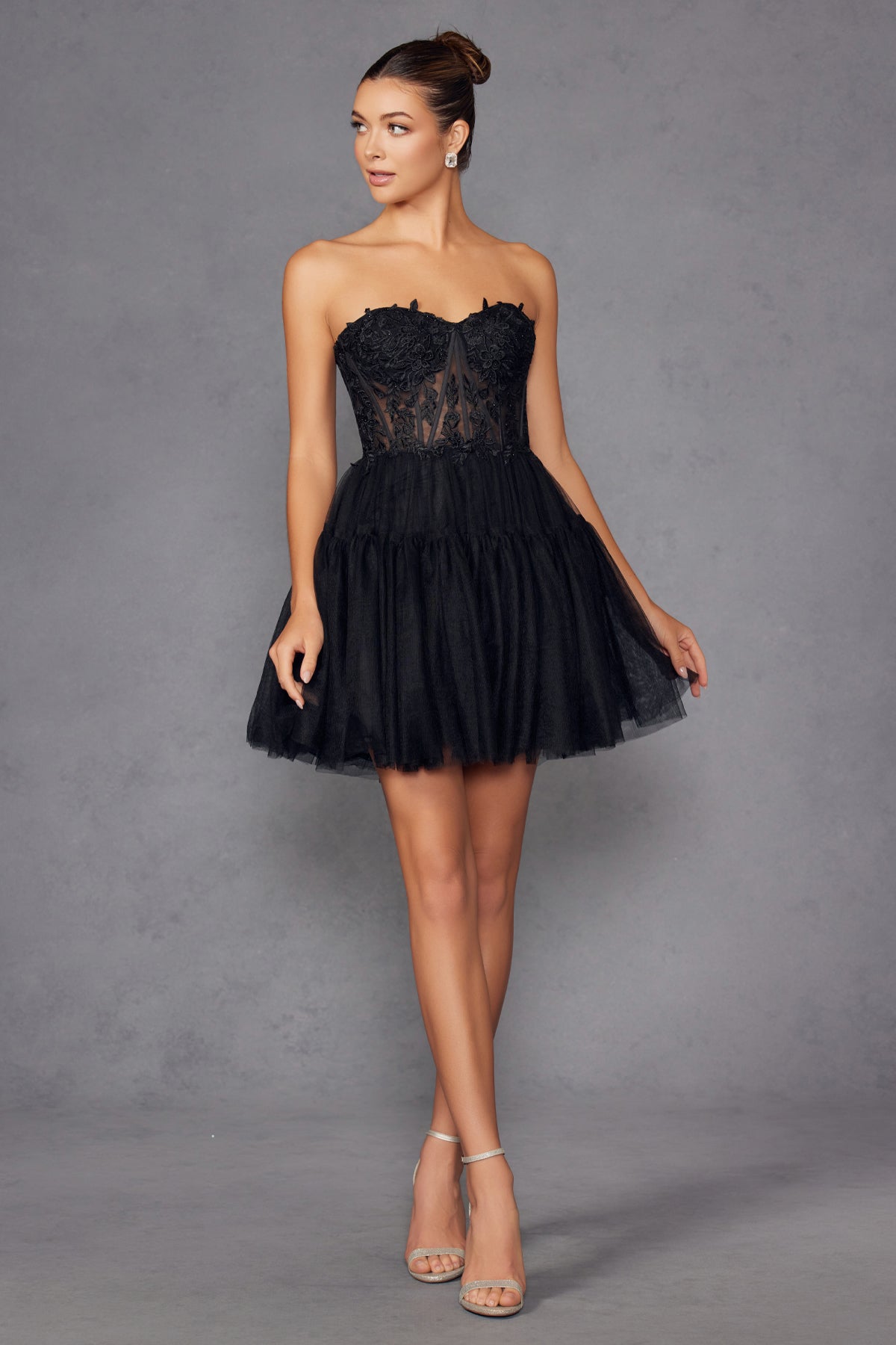 Make a statement in the Juliet JT2488S—a show-stopping strapless gown that's as versatile as you are! This beauty features an elegant high-low silhouette with cascading layered tulle that demands attention. The sheer corset bodice offers a touch of romance, while intricate lace detailing adds sophistication. Best part? The removable skirt lets you transform your look in seconds, taking you from red carpet glamour to dancing-till-dawn chic. Perfect for proms, galas, or any occasion where you want to turn heads and feel absolutely fabulous.