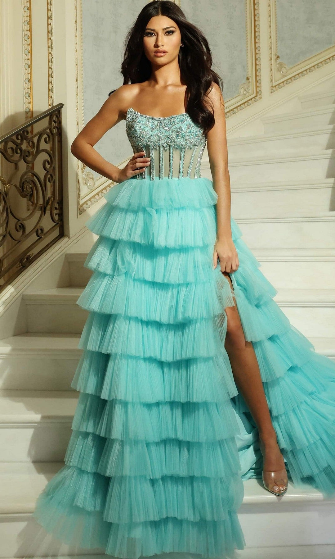 Elevate your evening with the stunning Jovani 44134 Dress, a show-stopping floor-length gown designed to make you feel absolutely radiant. This A-line masterpiece features a strapless straight neckline and a sheer corset bodice adorned with intricate beading and embellishments that catch the light beautifully. The tiered ruffle skirt adds dramatic movement and dimension, while a daring high slit provides both elegance and ease of movement. Layered tulle construction creates a romantic, ethereal silhouette that flatters every figure. The sheer corset back with zipper closure and matching embellishments ensures you look just as stunning from behind. Perfect for proms, galas, or any occasion where you want to command attention with confidence and grace.