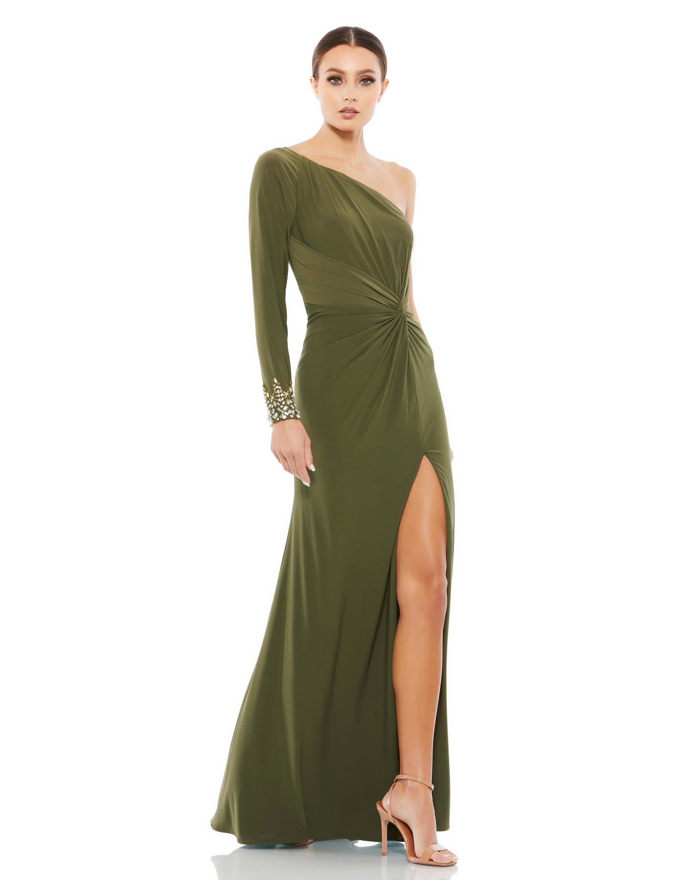 Crafted from smooth jersey fabric, this floor-grazing dress is textured with pleats, an off-center waist twist, and starburst beads and glittering rhinestones at the edge of the single sleeve. A high slit underscores the gown’s sexy and modern styling.