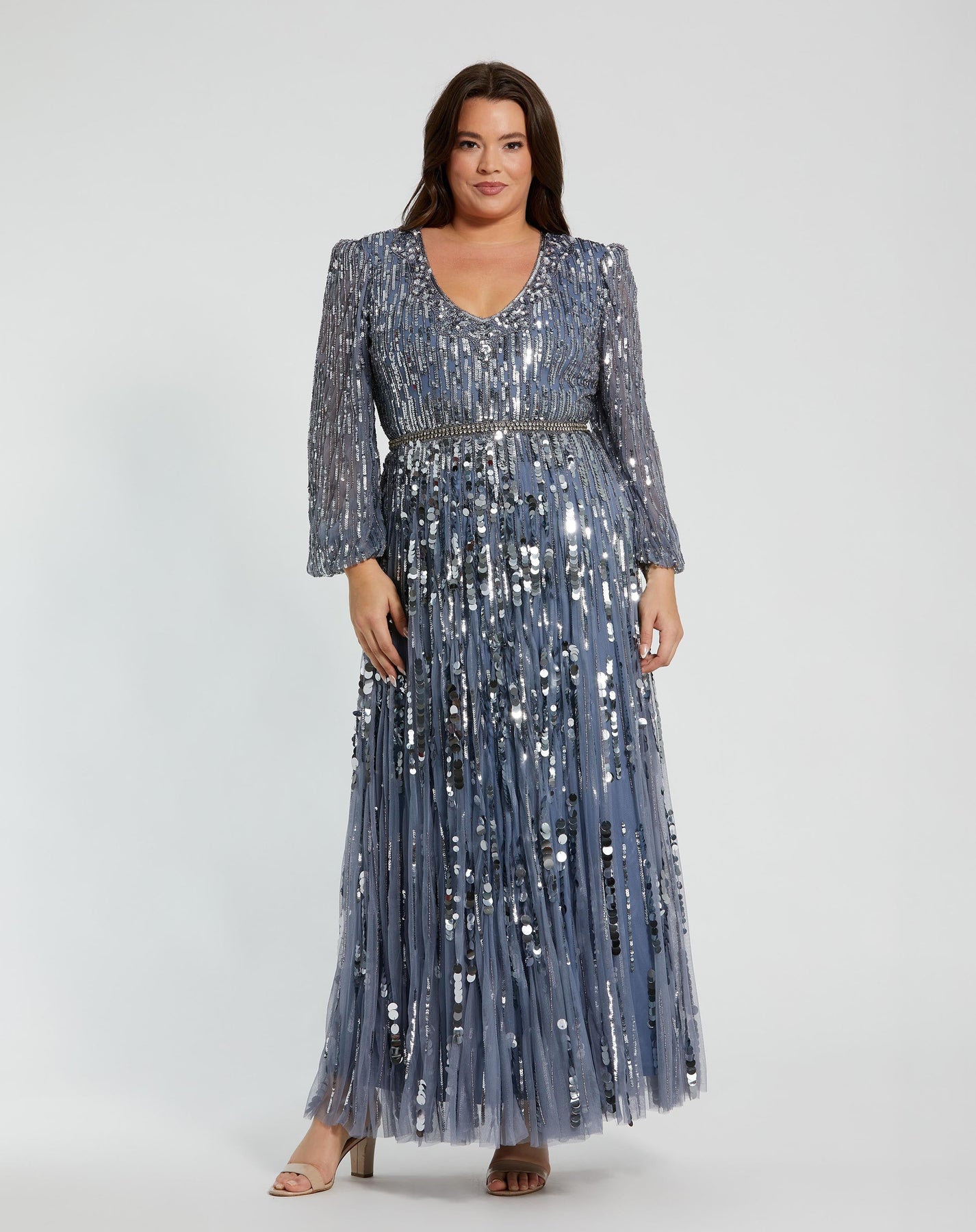 Shine bright like a diamond in Mac Duggal's Long Sleeve Beaded Crystal V Neck Gown. This mesmerizing dress is adorned with stunning beadwork and crystals, boasting a figure-flattering V-neckline. Perfect for any special occasion, pair with your favorite heels and feel like a queen! (Style #10019)