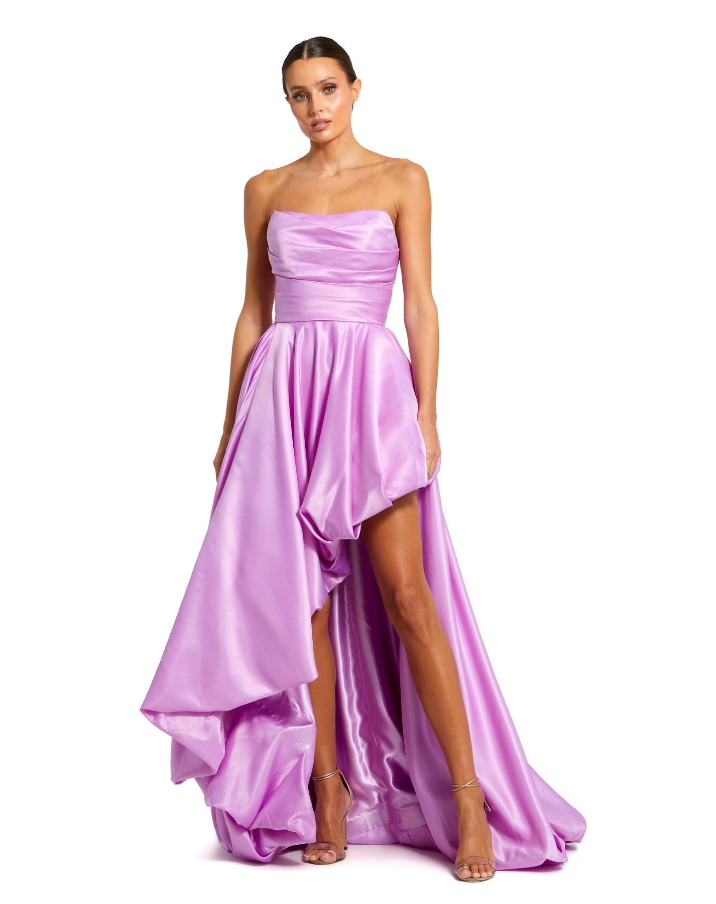Introducing our Strapless Ruched High Low Gown, a captivating blend of modern style and classic elegance. Crafted from luxurious satin fabric with a fully lined bodice and skirt, this gown features a chic strapless neckline and sleeveless design. With its dramatic asymmetrical high-low hemline, it promises to make a statement at any event.